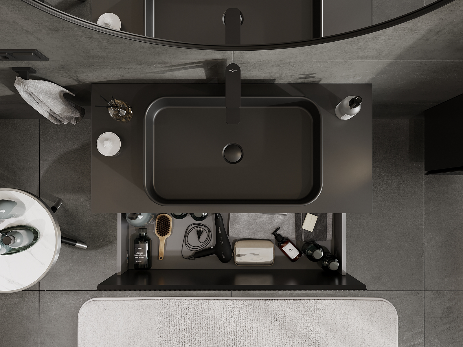 A fiókban lévő kivágás úgy van kialakítva, hogy befogadja a mosdó telepítéseknél szükséges szifont. Ennek köszönhetően a bútor teljesen funkcionálisan felszerelhető anélkül, hogy a fiók terének egy részét fel kellene áldozni a telepítés miatt.