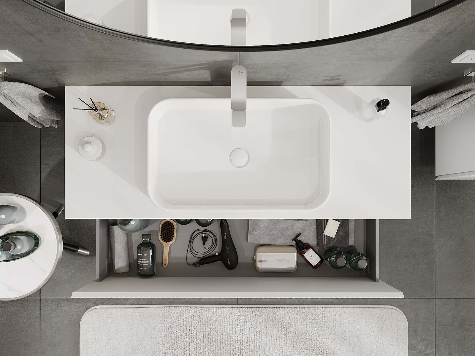 A fiókban lévő kivágás úgy van kialakítva, hogy befogadja a mosdó telepítéseknél szükséges szifont. Ennek köszönhetően a bútor teljesen funkcionálisan felszerelhető anélkül, hogy a fiók terének egy részét fel kellene áldozni a telepítés miatt.