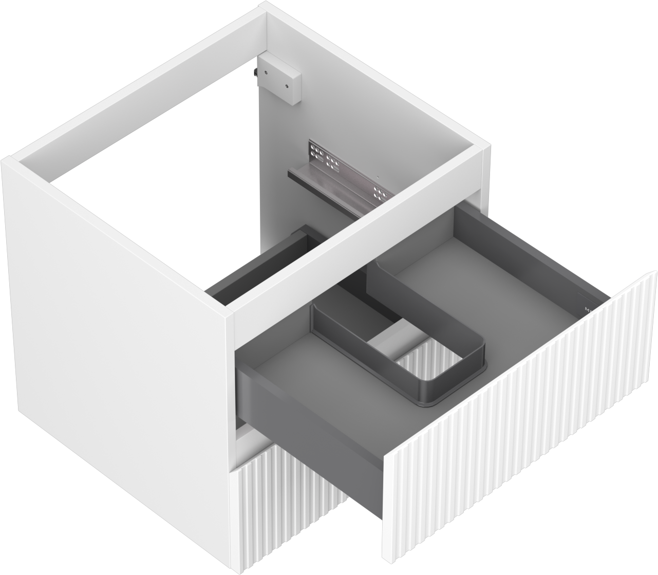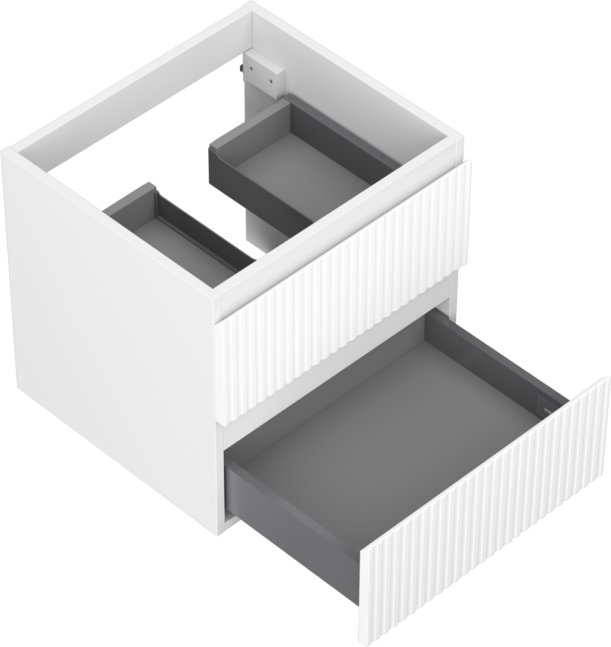 A fiókban lévő kivágás úgy van kialakítva, hogy befogadja a mosdó telepítéseknél szükséges szifont. Ennek köszönhetően a bútor teljesen funkcionálisan felszerelhető anélkül, hogy a fiók terének egy részét fel kellene áldozni a telepítés miatt.