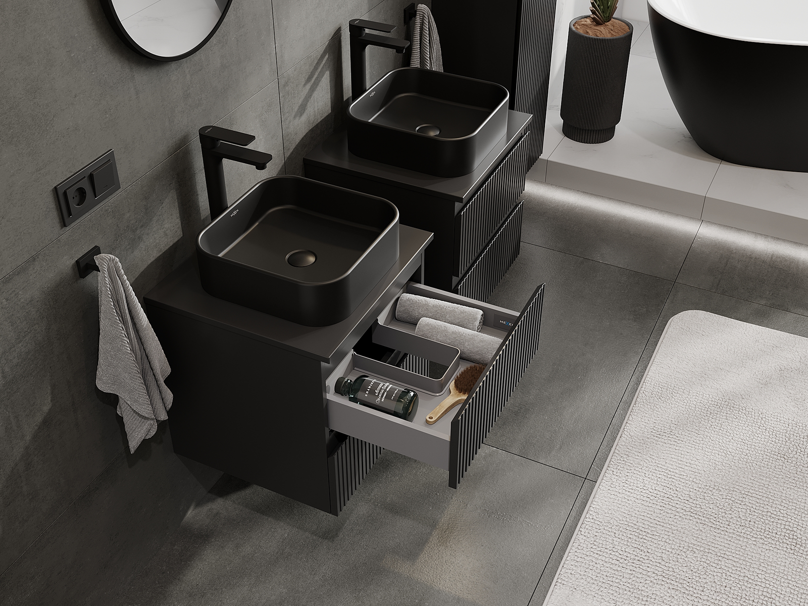 A fiókban lévő kivágás úgy van kialakítva, hogy befogadja a mosdó telepítéseknél szükséges szifont. Ennek köszönhetően a bútor teljesen funkcionálisan felszerelhető anélkül, hogy a fiók terének egy részét fel kellene áldozni a telepítés miatt.