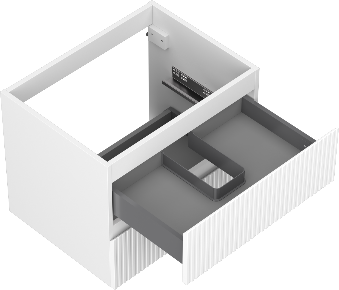 A fiókban lévő kivágás úgy van kialakítva, hogy befogadja a mosdó telepítéseknél szükséges szifont. Ennek köszönhetően a bútor teljesen funkcionálisan felszerelhető anélkül, hogy a fiók terének egy részét fel kellene áldozni a telepítés miatt.