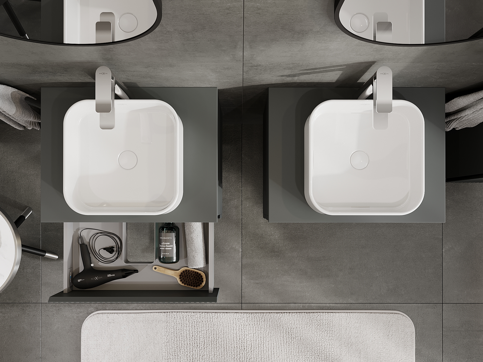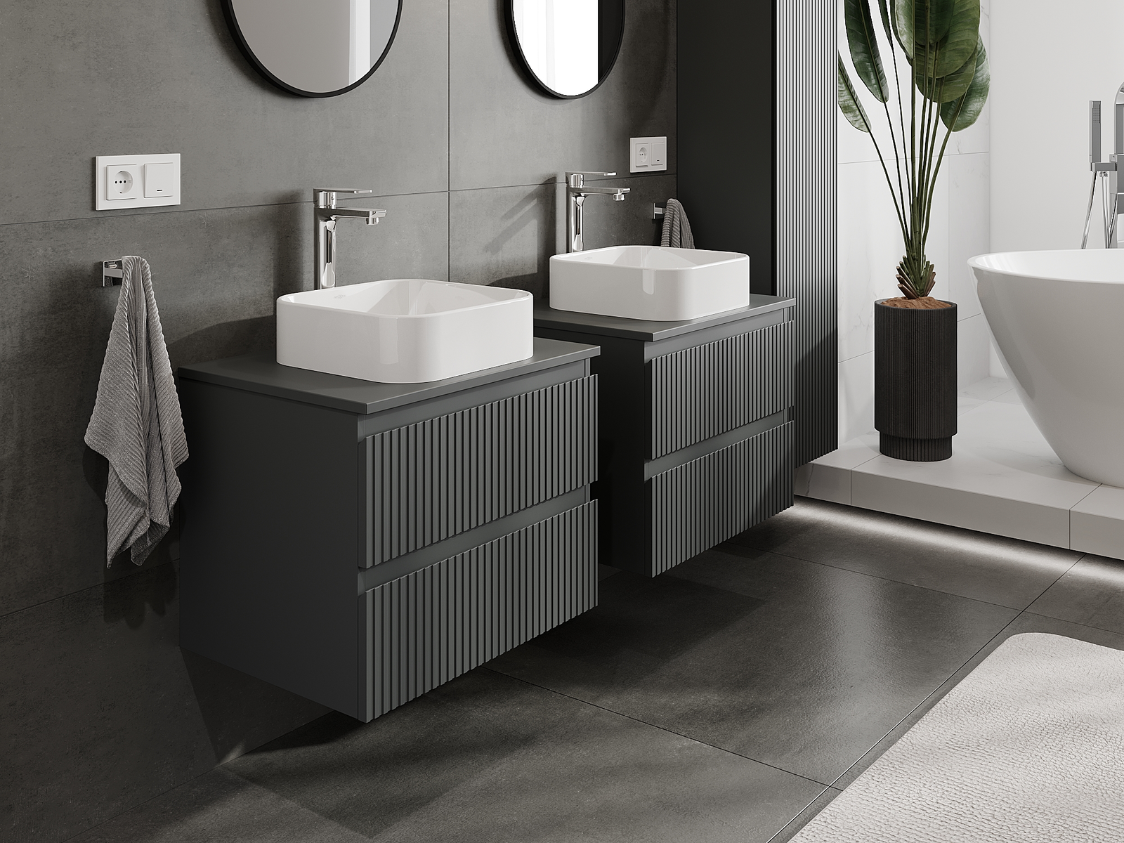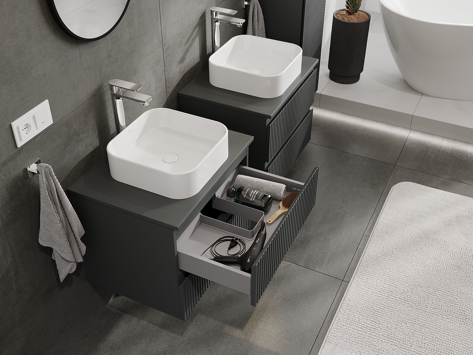 A moduláris fürdőszobabútorainkat különböző színkonfigurációkban lehet kombinálni, lehetővé téve a teljes személyre szabást. Kiválasztható mind az egyes elemek megjelenése, mind pedig funkciói, ami lehetővé teszi a bútorok személyes stílus- és használati preferenciákhoz való igazítását.