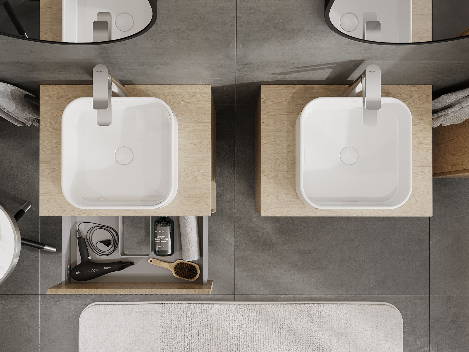 A fiókban lévő kivágás úgy van kialakítva, hogy befogadja a mosdó telepítéseknél szükséges szifont. Ennek köszönhetően a bútor teljesen funkcionálisan felszerelhető anélkül, hogy a fiók terének egy részét fel kellene áldozni a telepítés miatt.