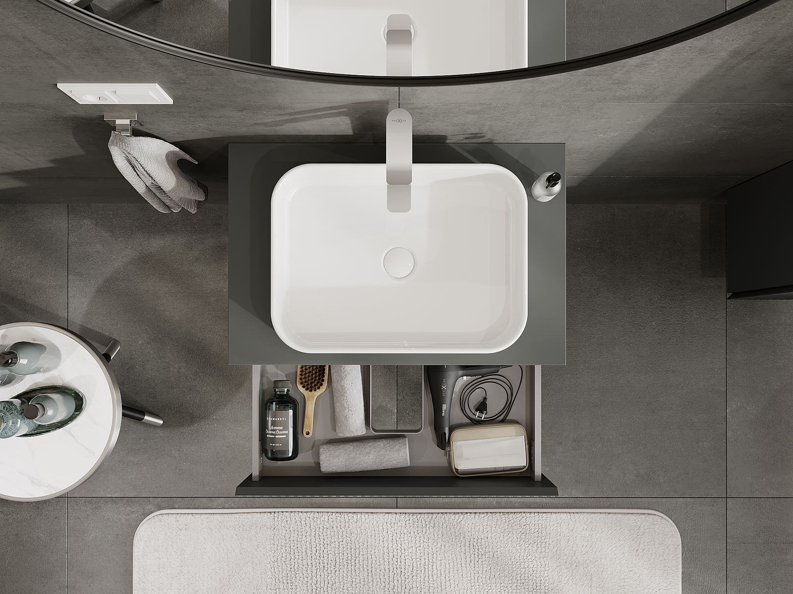 A fiókban lévő kivágás úgy van kialakítva, hogy befogadja a mosdó telepítéseknél szükséges szifont. Ennek köszönhetően a bútor teljesen funkcionálisan felszerelhető anélkül, hogy a fiók terének egy részét fel kellene áldozni a telepítés miatt.