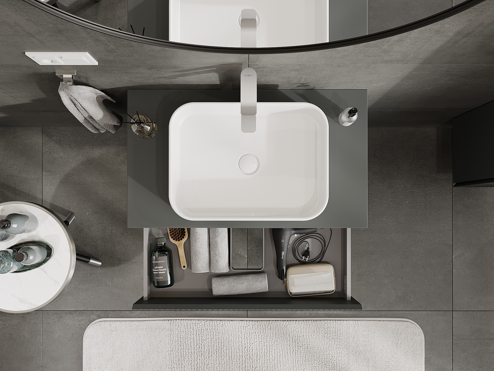 A fiókban lévő kivágás úgy van kialakítva, hogy befogadja a mosdó telepítéseknél szükséges szifont. Ennek köszönhetően a bútor teljesen funkcionálisan felszerelhető anélkül, hogy a fiók terének egy részét fel kellene áldozni a telepítés miatt.