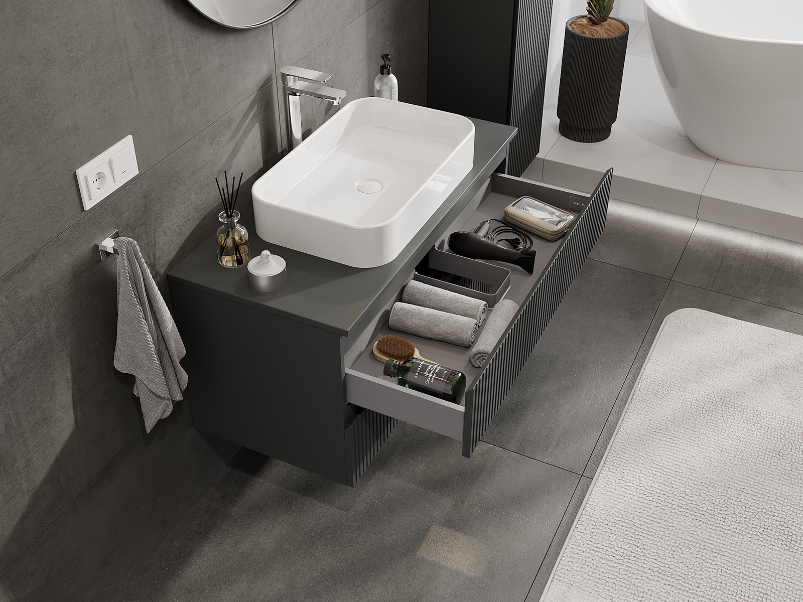 A fiókban lévő kivágás úgy van kialakítva, hogy befogadja a mosdó telepítéseknél szükséges szifont. Ennek köszönhetően a bútor teljesen funkcionálisan felszerelhető anélkül, hogy a fiók terének egy részét fel kellene áldozni a telepítés miatt.