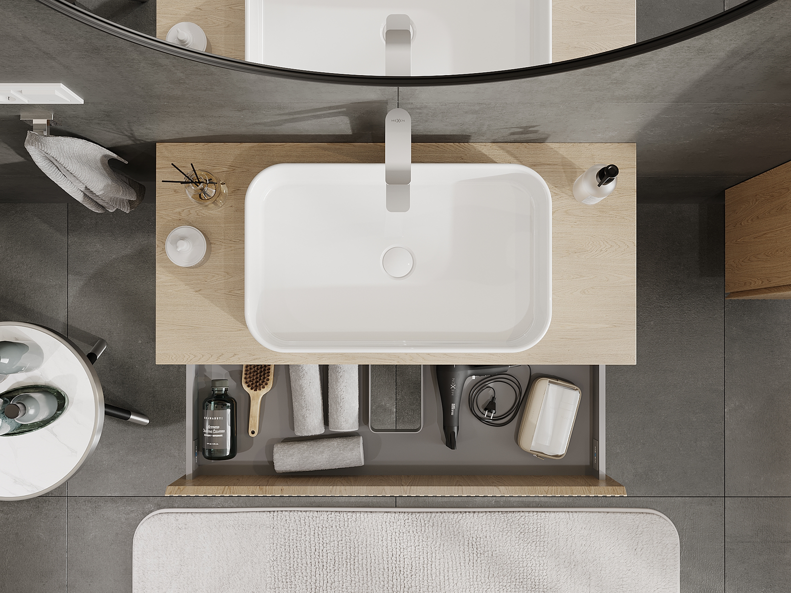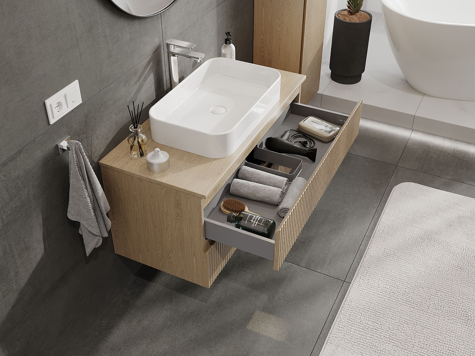 A fiókban lévő kivágás úgy van kialakítva, hogy befogadja a mosdó telepítéseknél szükséges szifont. Ennek köszönhetően a bútor teljesen funkcionálisan felszerelhető anélkül, hogy a fiók terének egy részét fel kellene áldozni a telepítés miatt.