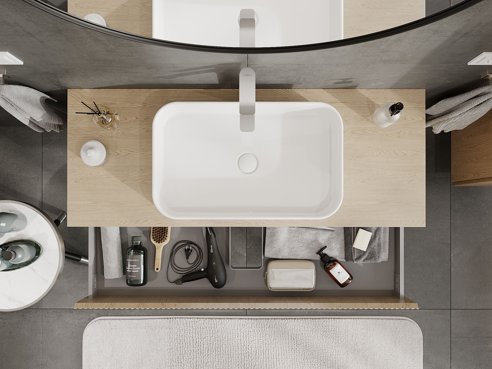 A fiókban lévő kivágás úgy van kialakítva, hogy befogadja a mosdó telepítéseknél szükséges szifont. Ennek köszönhetően a bútor teljesen funkcionálisan felszerelhető anélkül, hogy a fiók terének egy részét fel kellene áldozni a telepítés miatt.