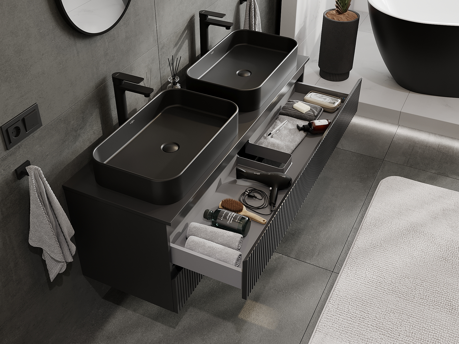 A fiókban lévő kivágás úgy van kialakítva, hogy befogadja a mosdó telepítéseknél szükséges szifont. Ennek köszönhetően a bútor teljesen funkcionálisan felszerelhető anélkül, hogy a fiók terének egy részét fel kellene áldozni a telepítés miatt.