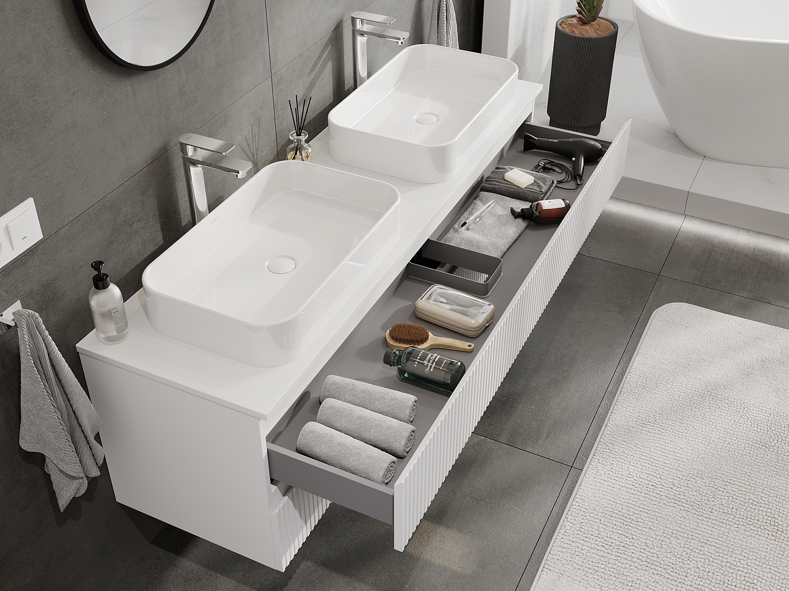 A moduláris fürdőszobabútorainkat különböző színkonfigurációkban lehet kombinálni, lehetővé téve a teljes személyre szabást. Kiválasztható mind az egyes elemek megjelenése, mind pedig funkciói, ami lehetővé teszi a bútorok személyes stílus- és használati preferenciákhoz való igazítását.