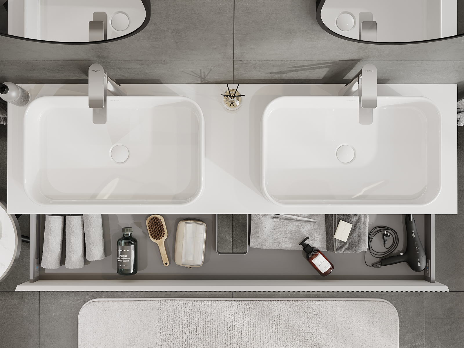A fiókban lévő kivágás úgy van kialakítva, hogy befogadja a mosdó telepítéseknél szükséges szifont. Ennek köszönhetően a bútor teljesen funkcionálisan felszerelhető anélkül, hogy a fiók terének egy részét fel kellene áldozni a telepítés miatt.