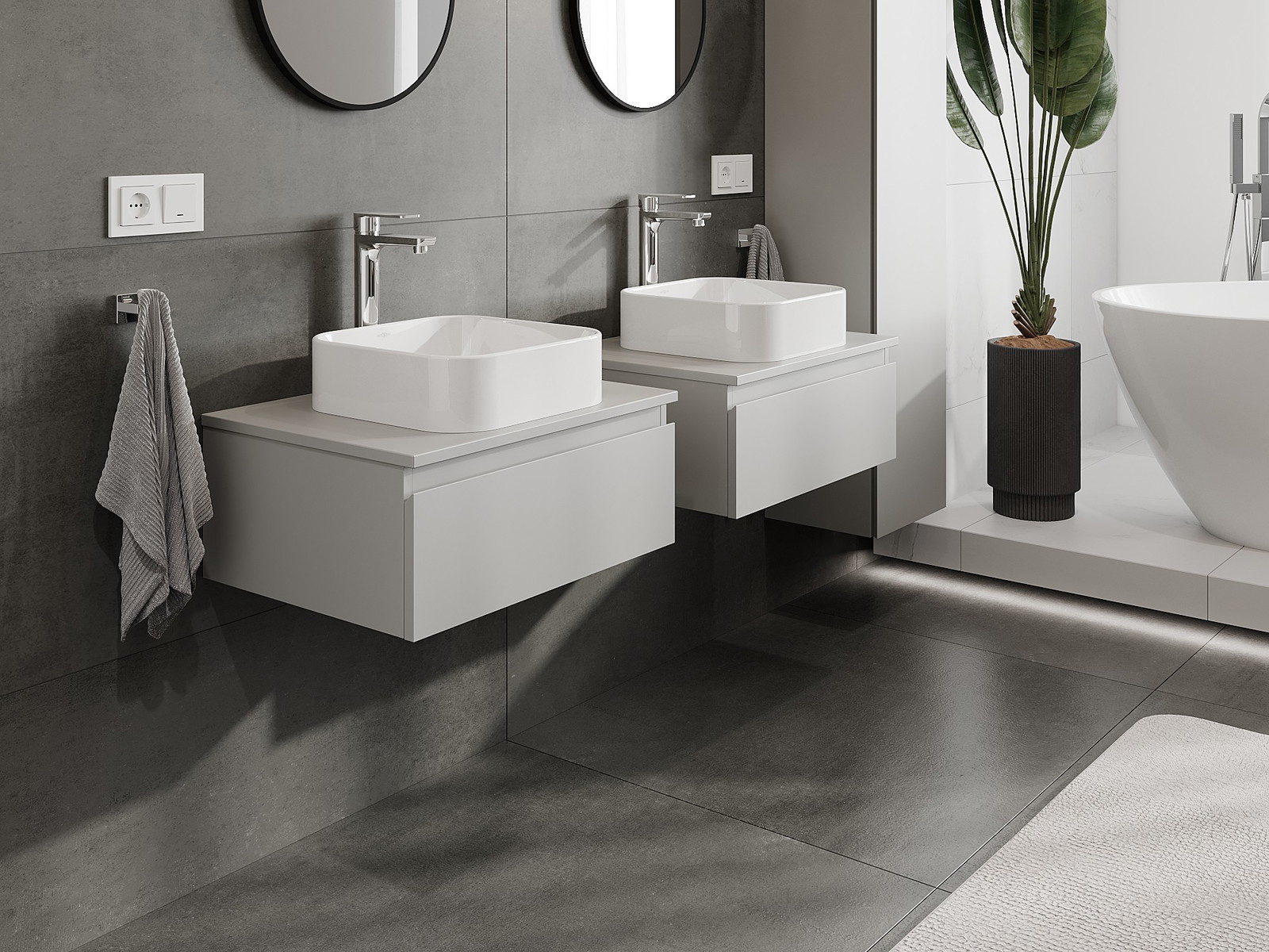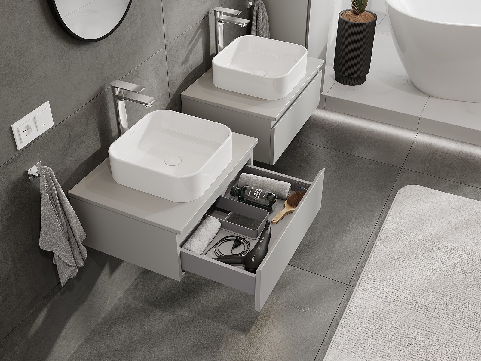 A moduláris fürdőszobabútorainkat különböző színkonfigurációkban lehet kombinálni, lehetővé téve a teljes személyre szabást. Kiválasztható mind az egyes elemek megjelenése, mind pedig funkciói, ami lehetővé teszi a bútorok személyes stílus- és használati preferenciákhoz való igazítását.