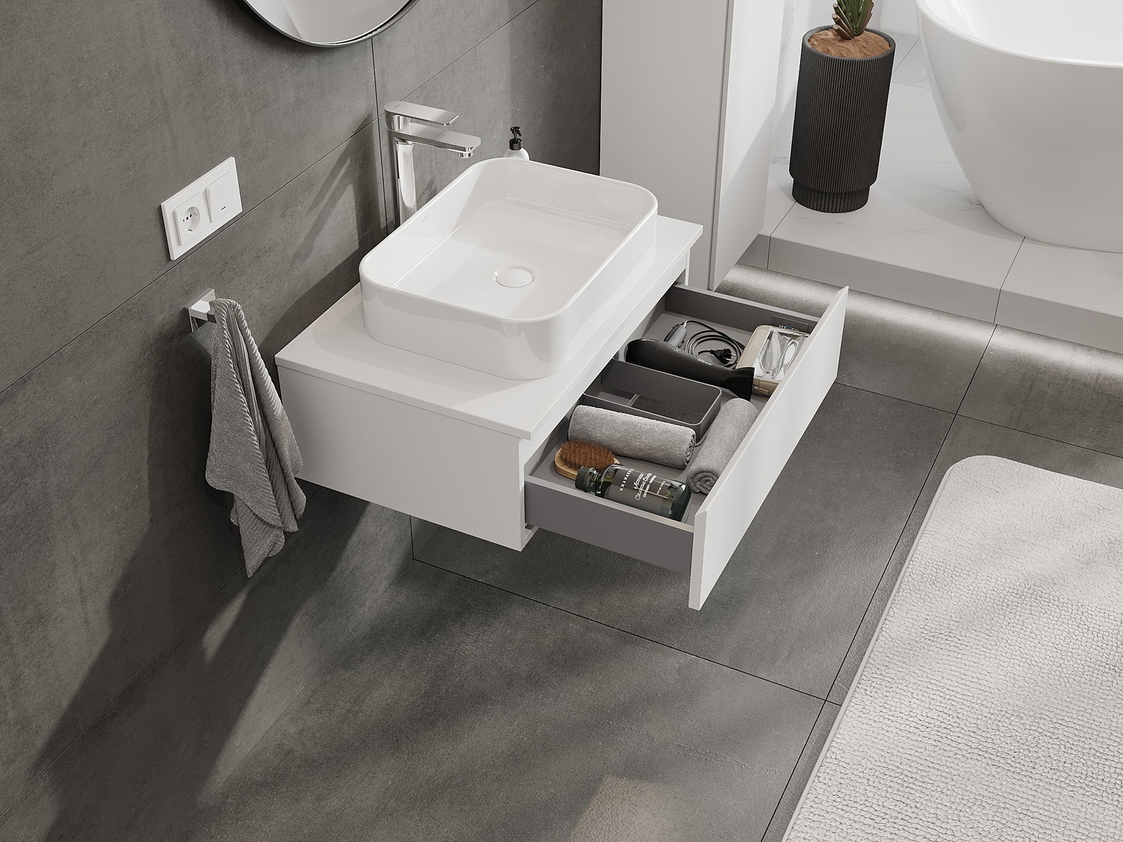 A fiókban lévő kivágás úgy van kialakítva, hogy befogadja a mosdó telepítéseknél szükséges szifont. Ennek köszönhetően a bútor teljesen funkcionálisan felszerelhető anélkül, hogy a fiók terének egy részét fel kellene áldozni a telepítés miatt.