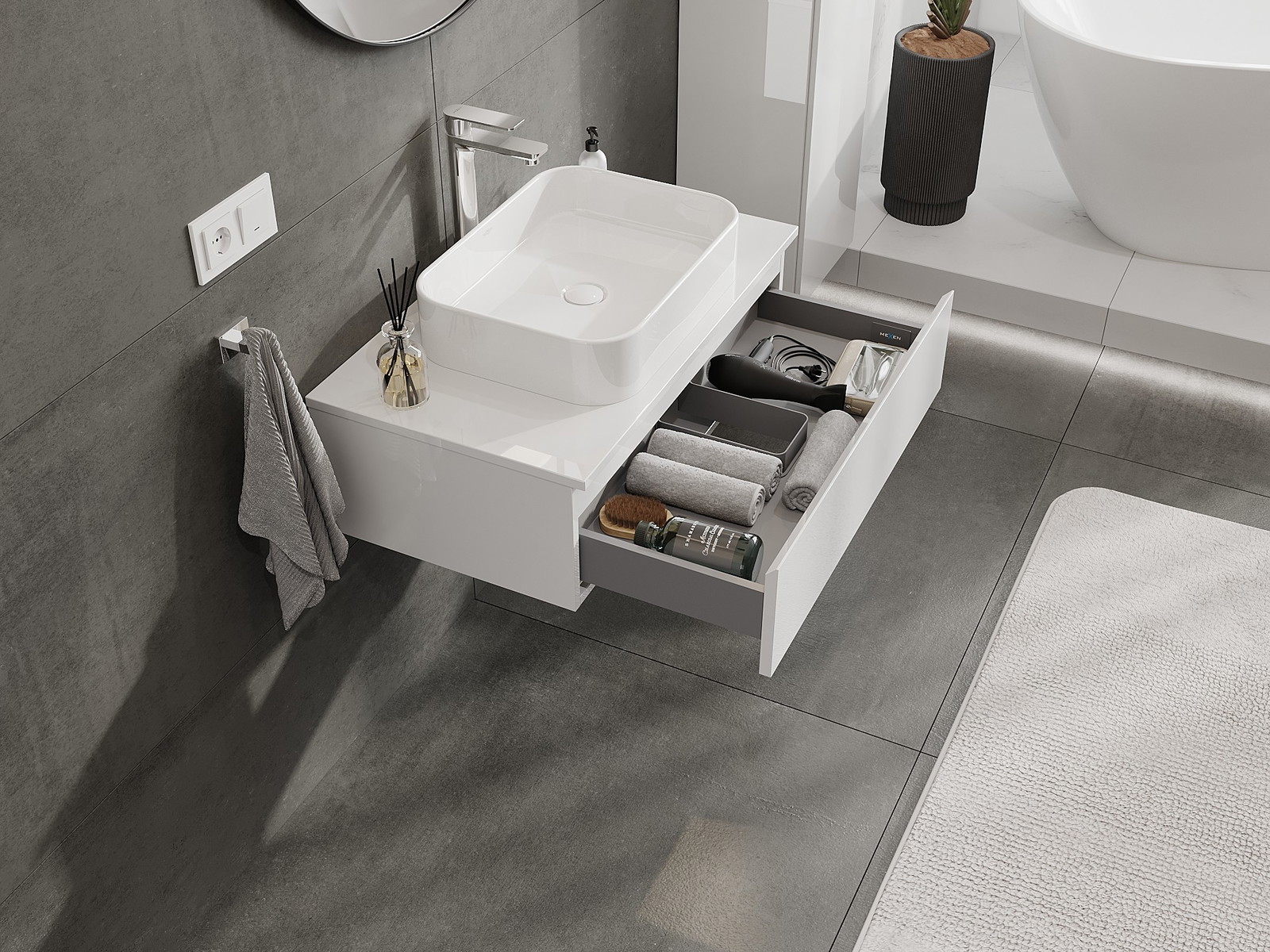 A fiókban lévő kivágás úgy van kialakítva, hogy befogadja a mosdó telepítéseknél szükséges szifont. Ennek köszönhetően a bútor teljesen funkcionálisan felszerelhető anélkül, hogy a fiók terének egy részét fel kellene áldozni a telepítés miatt.
