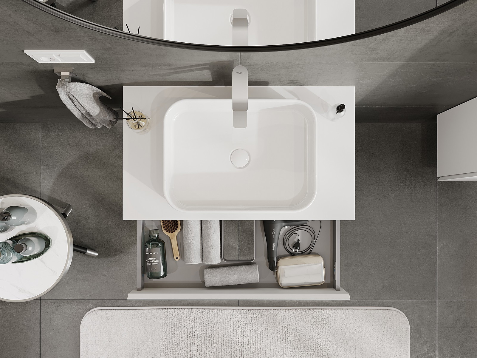 A fiókban lévő kivágás úgy van kialakítva, hogy befogadja a mosdó telepítéseknél szükséges szifont. Ennek köszönhetően a bútor teljesen funkcionálisan felszerelhető anélkül, hogy a fiók terének egy részét fel kellene áldozni a telepítés miatt.