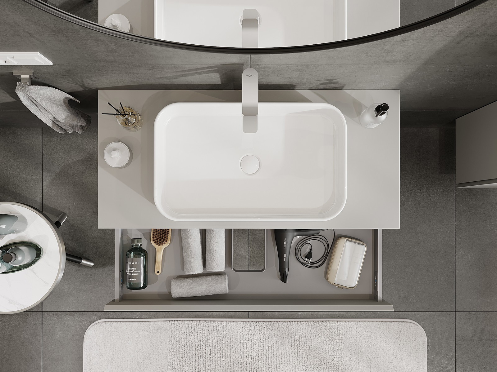 A fiókban lévő kivágás úgy van kialakítva, hogy befogadja a mosdó telepítéseknél szükséges szifont. Ennek köszönhetően a bútor teljesen funkcionálisan felszerelhető anélkül, hogy a fiók terének egy részét fel kellene áldozni a telepítés miatt.