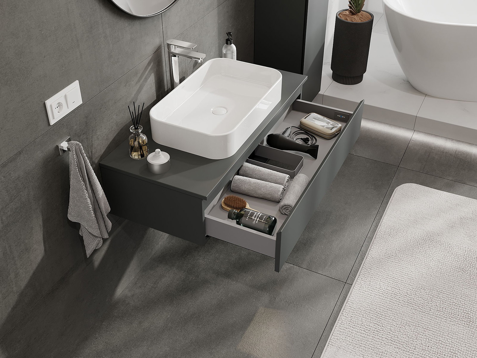 A fiókban lévő kivágás úgy van kialakítva, hogy befogadja a mosdó telepítéseknél szükséges szifont. Ennek köszönhetően a bútor teljesen funkcionálisan felszerelhető anélkül, hogy a fiók terének egy részét fel kellene áldozni a telepítés miatt.
