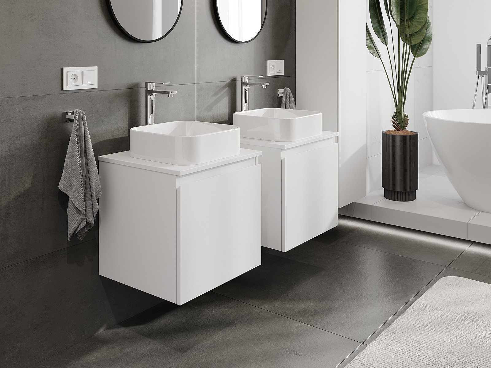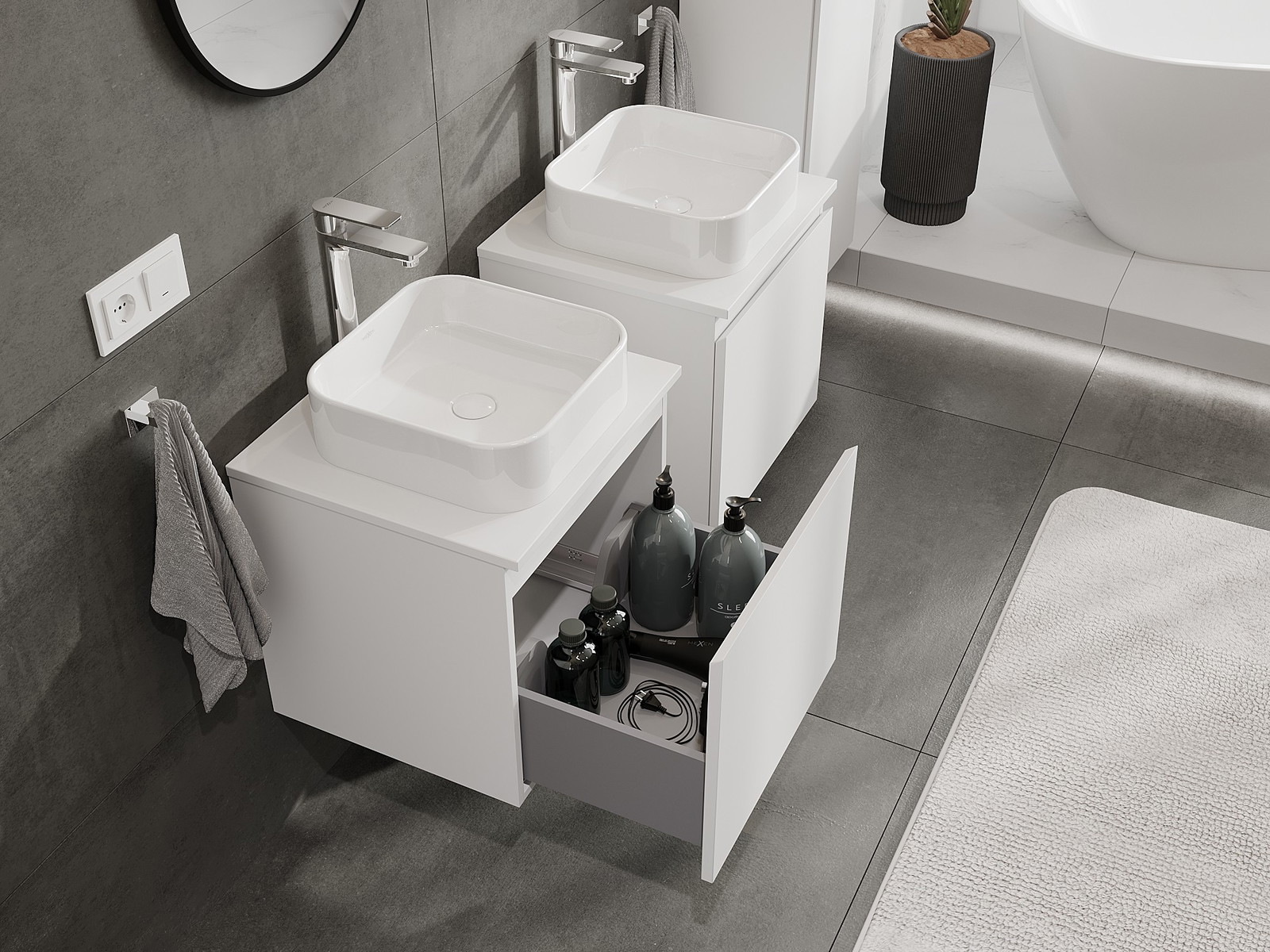 A moduláris fürdőszobabútorainkat különböző színkonfigurációkban lehet kombinálni, lehetővé téve a teljes személyre szabást. Kiválasztható mind az egyes elemek megjelenése, mind pedig funkciói, ami lehetővé teszi a bútorok személyes stílus- és használati preferenciákhoz való igazítását.