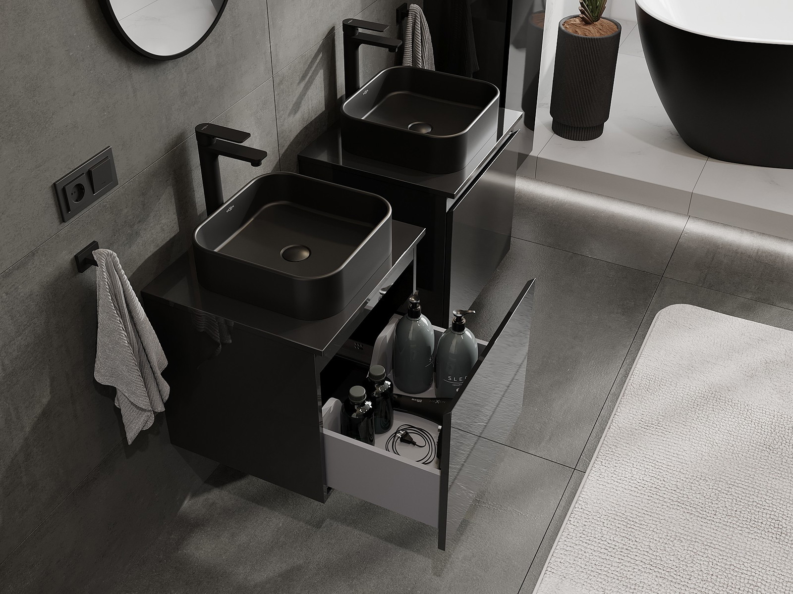 A moduláris fürdőszobabútorainkat különböző színkonfigurációkban lehet kombinálni, lehetővé téve a teljes személyre szabást. Kiválasztható mind az egyes elemek megjelenése, mind pedig funkciói, ami lehetővé teszi a bútorok személyes stílus- és használati preferenciákhoz való igazítását.