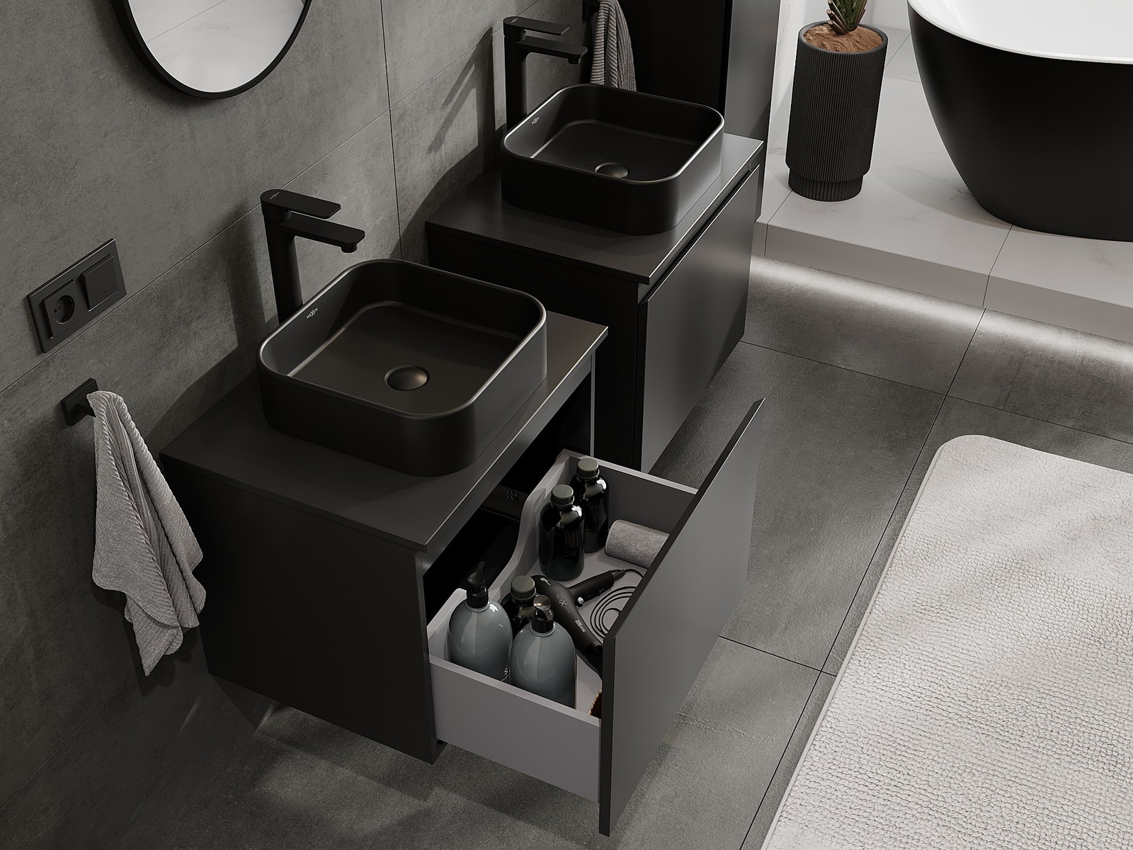 A moduláris fürdőszobabútorainkat különböző színkonfigurációkban lehet kombinálni, lehetővé téve a teljes személyre szabást. Kiválasztható mind az egyes elemek megjelenése, mind pedig funkciói, ami lehetővé teszi a bútorok személyes stílus- és használati preferenciákhoz való igazítását.