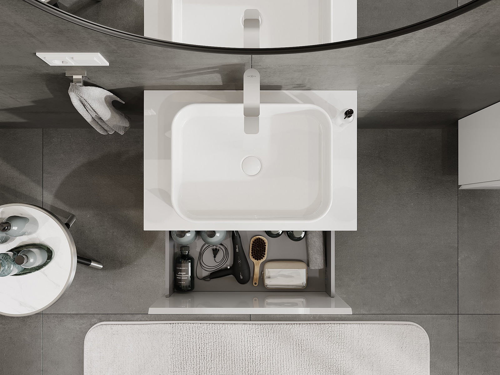 A fiókban lévő kivágás úgy van kialakítva, hogy befogadja a mosdó telepítéseknél szükséges szifont. Ennek köszönhetően a bútor teljesen funkcionálisan felszerelhető anélkül, hogy a fiók terének egy részét fel kellene áldozni a telepítés miatt.