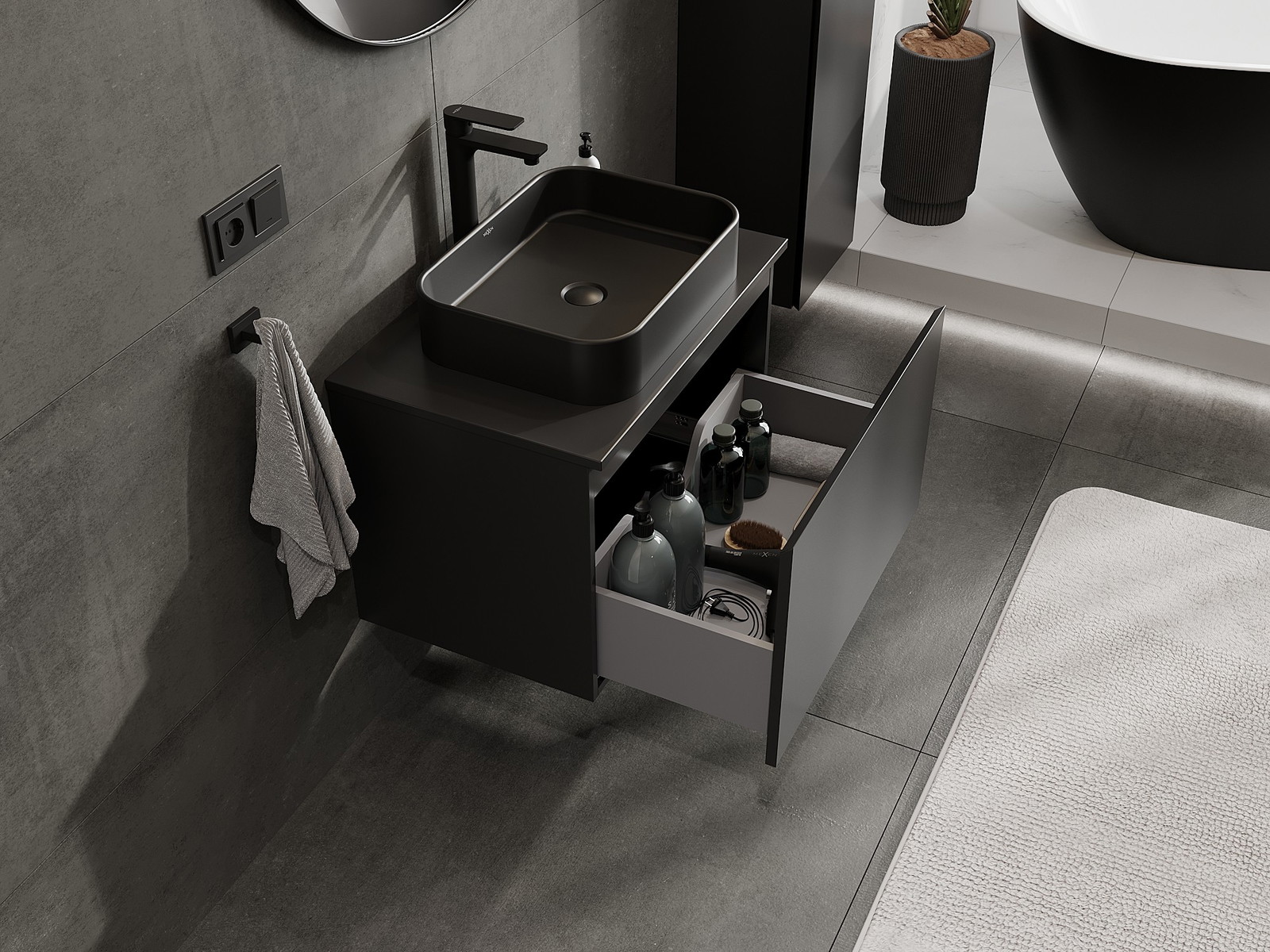 A fiókban lévő kivágás úgy van kialakítva, hogy befogadja a mosdó telepítéseknél szükséges szifont. Ennek köszönhetően a bútor teljesen funkcionálisan felszerelhető anélkül, hogy a fiók terének egy részét fel kellene áldozni a telepítés miatt.