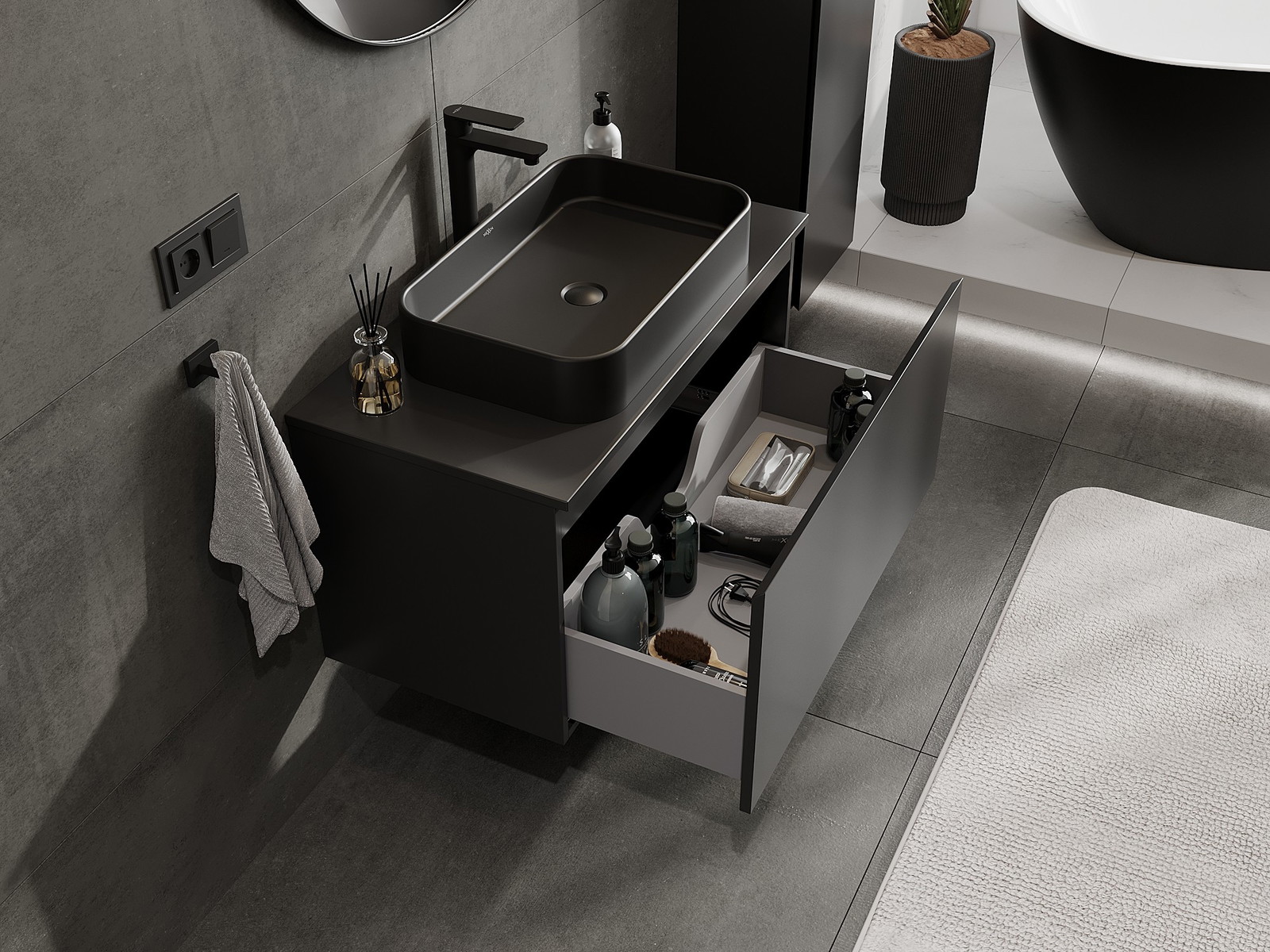 A fiókban lévő kivágás úgy van kialakítva, hogy befogadja a mosdó telepítéseknél szükséges szifont. Ennek köszönhetően a bútor teljesen funkcionálisan felszerelhető anélkül, hogy a fiók terének egy részét fel kellene áldozni a telepítés miatt.