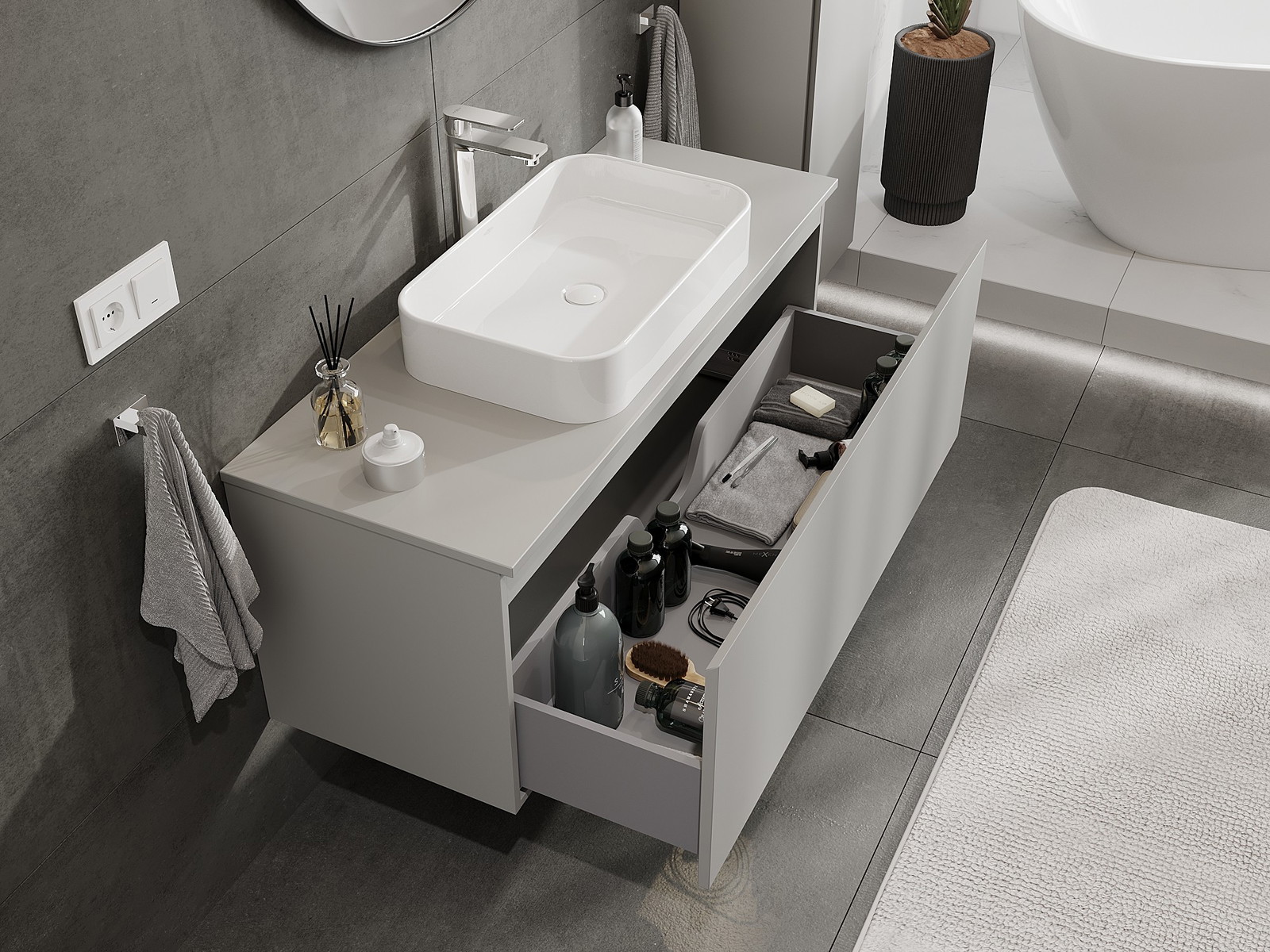 A fiókban lévő kivágás úgy van kialakítva, hogy befogadja a mosdó telepítéseknél szükséges szifont. Ennek köszönhetően a bútor teljesen funkcionálisan felszerelhető anélkül, hogy a fiók terének egy részét fel kellene áldozni a telepítés miatt.
