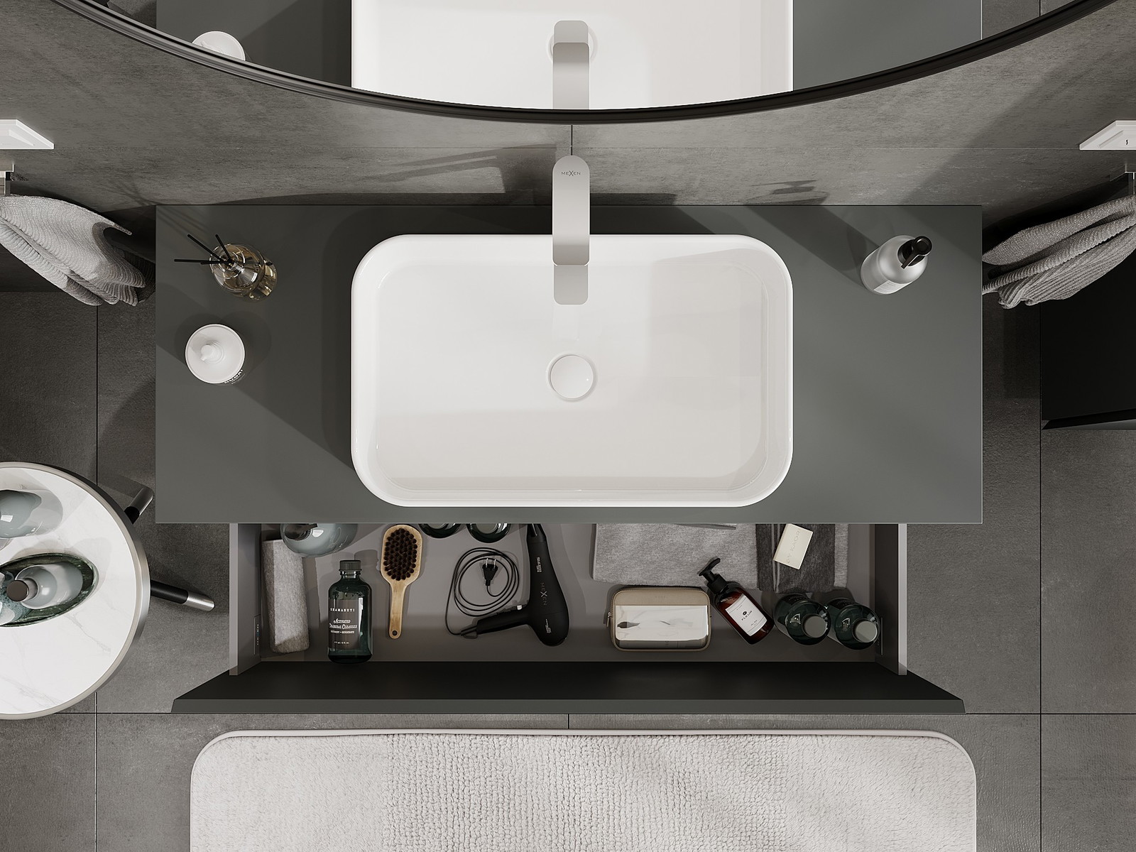 A fiókban lévő kivágás úgy van kialakítva, hogy befogadja a mosdó telepítéseknél szükséges szifont. Ennek köszönhetően a bútor teljesen funkcionálisan felszerelhető anélkül, hogy a fiók terének egy részét fel kellene áldozni a telepítés miatt.