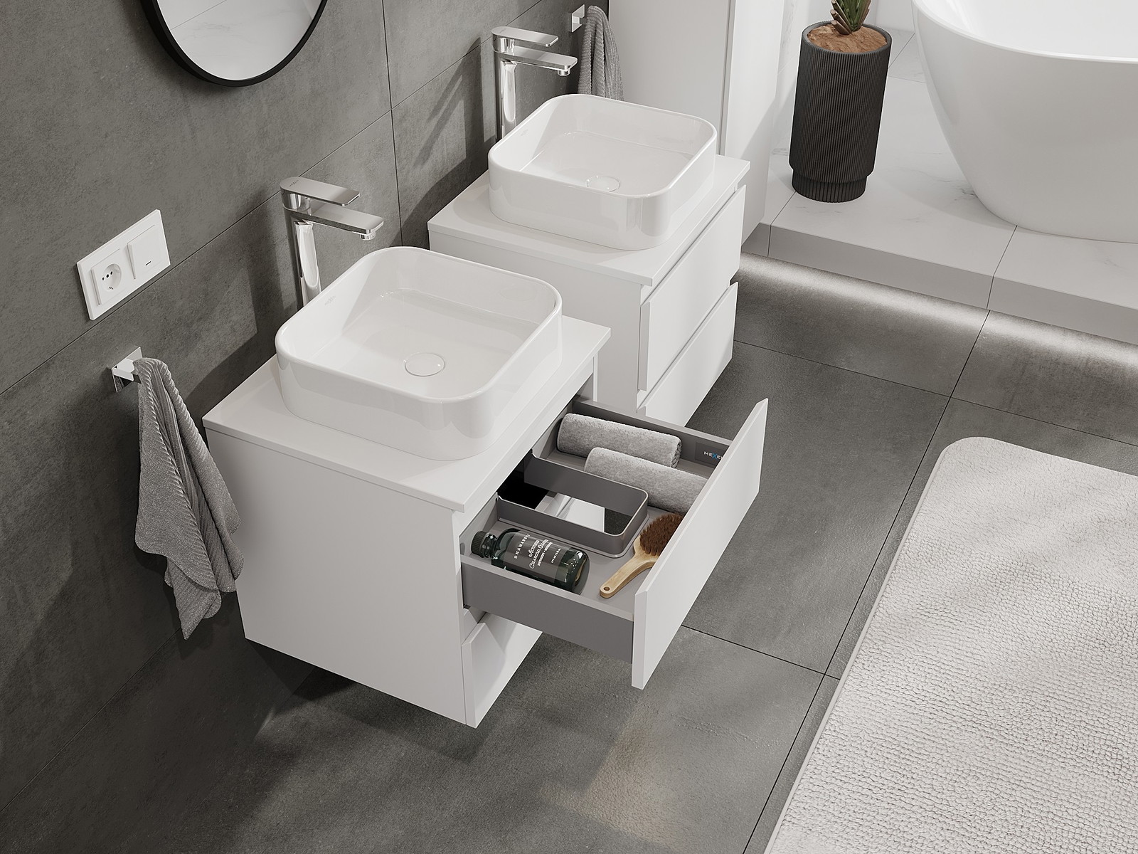 A fiókban lévő kivágás úgy van kialakítva, hogy befogadja a mosdó telepítéseknél szükséges szifont. Ennek köszönhetően a bútor teljesen funkcionálisan felszerelhető anélkül, hogy a fiók terének egy részét fel kellene áldozni a telepítés miatt.