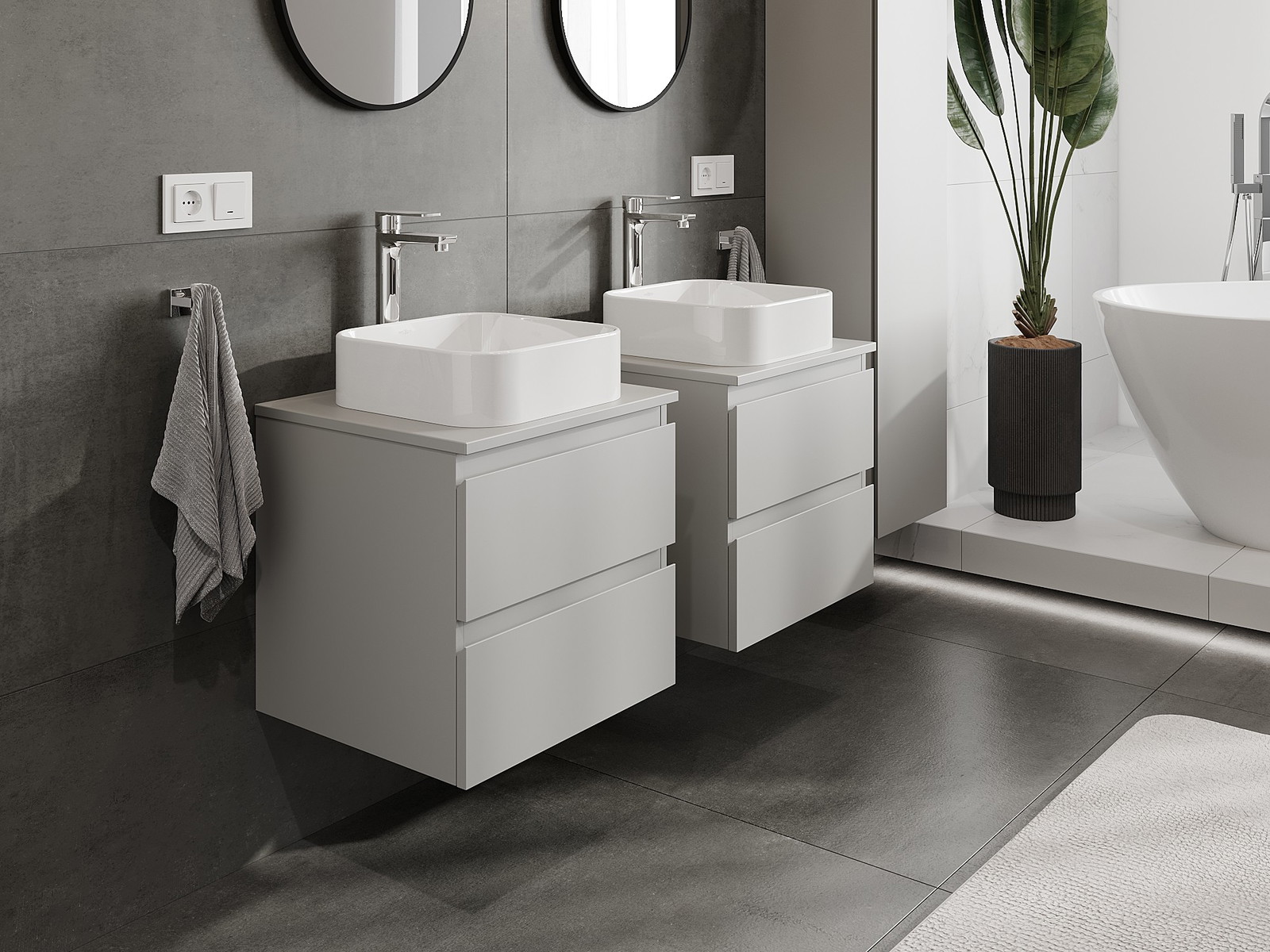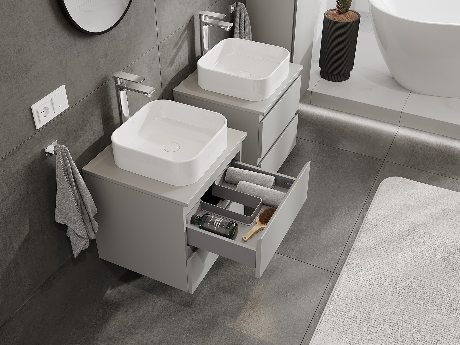 A moduláris fürdőszobabútorainkat különböző színkonfigurációkban lehet kombinálni, lehetővé téve a teljes személyre szabást. Kiválasztható mind az egyes elemek megjelenése, mind pedig funkciói, ami lehetővé teszi a bútorok személyes stílus- és használati preferenciákhoz való igazítását.