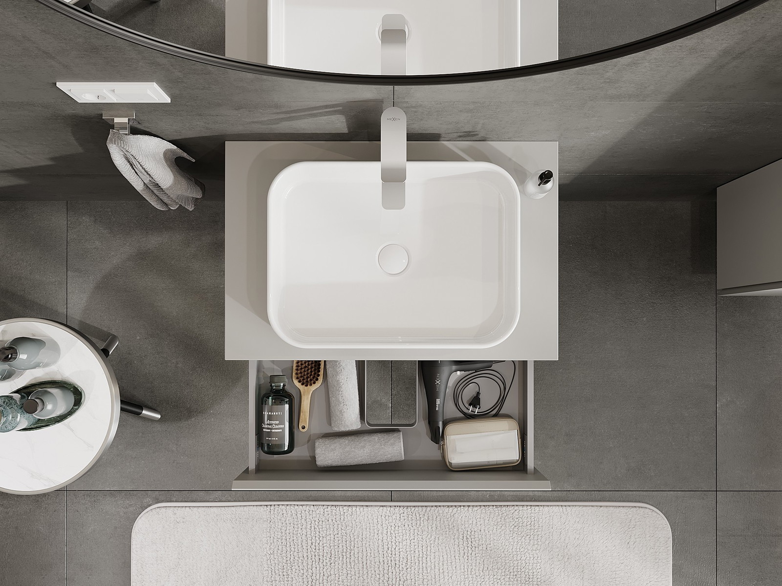 A fiókban lévő kivágás úgy van kialakítva, hogy befogadja a mosdó telepítéseknél szükséges szifont. Ennek köszönhetően a bútor teljesen funkcionálisan felszerelhető anélkül, hogy a fiók terének egy részét fel kellene áldozni a telepítés miatt.
