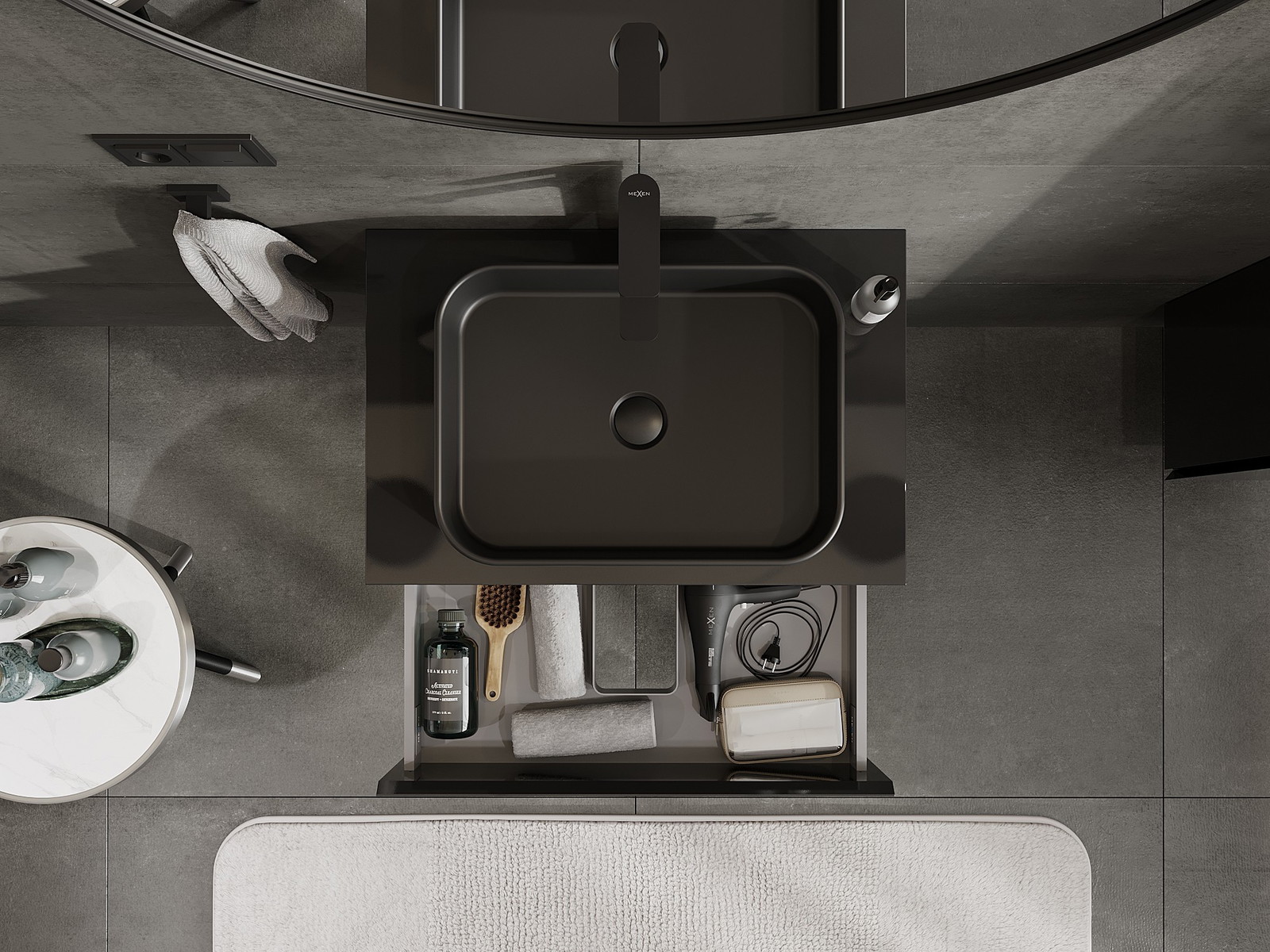 A fiókban lévő kivágás úgy van kialakítva, hogy befogadja a mosdó telepítéseknél szükséges szifont. Ennek köszönhetően a bútor teljesen funkcionálisan felszerelhető anélkül, hogy a fiók terének egy részét fel kellene áldozni a telepítés miatt.