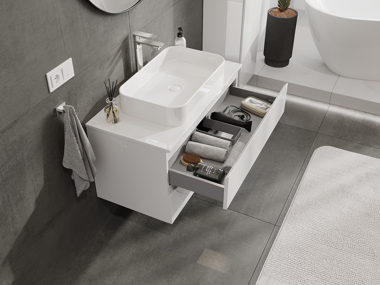 A fiókban lévő kivágás úgy van kialakítva, hogy befogadja a mosdó telepítéseknél szükséges szifont. Ennek köszönhetően a bútor teljesen funkcionálisan felszerelhető anélkül, hogy a fiók terének egy részét fel kellene áldozni a telepítés miatt.