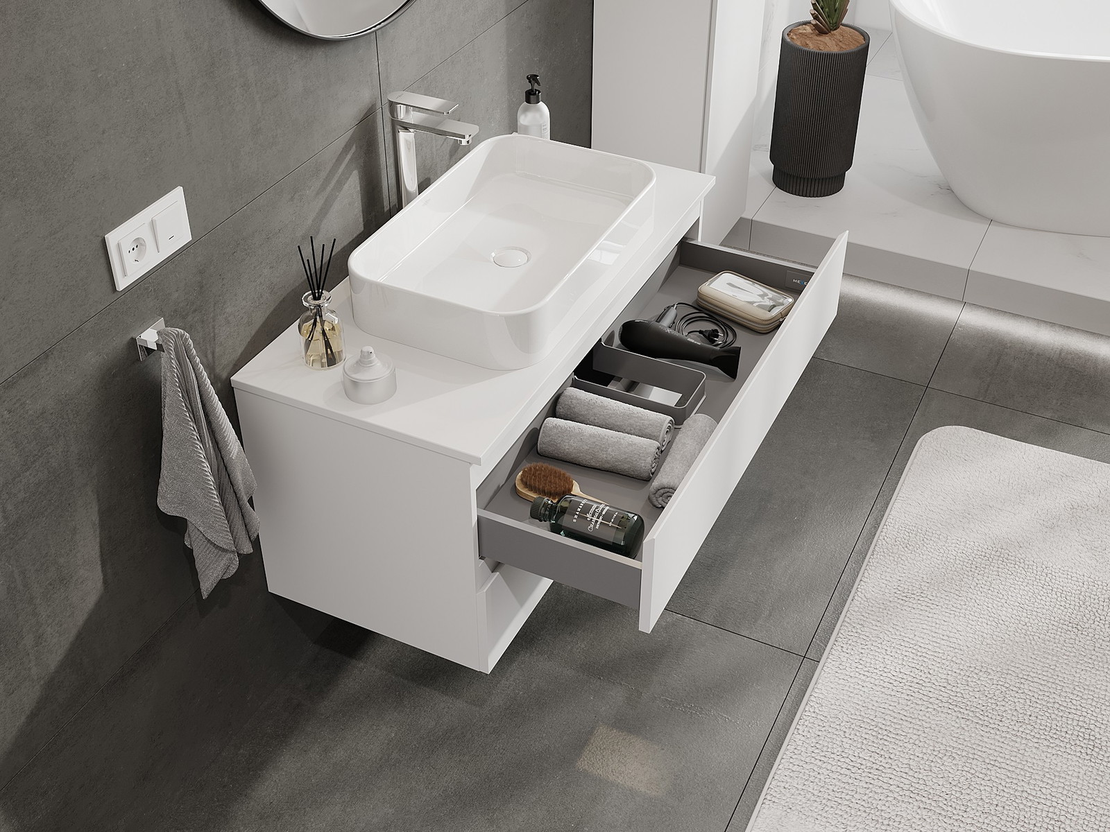 A fiókban lévő kivágás úgy van kialakítva, hogy befogadja a mosdó telepítéseknél szükséges szifont. Ennek köszönhetően a bútor teljesen funkcionálisan felszerelhető anélkül, hogy a fiók terének egy részét fel kellene áldozni a telepítés miatt.