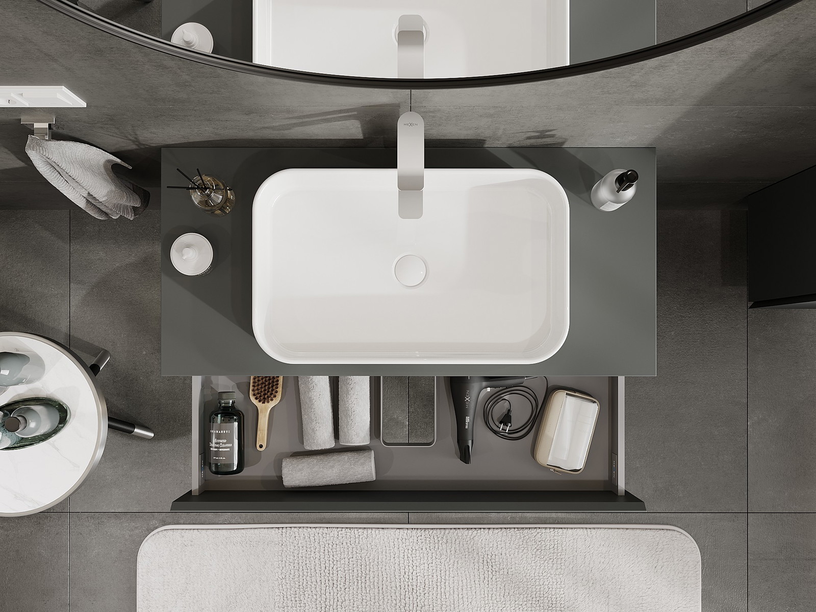 A fiókban lévő kivágás úgy van kialakítva, hogy befogadja a mosdó telepítéseknél szükséges szifont. Ennek köszönhetően a bútor teljesen funkcionálisan felszerelhető anélkül, hogy a fiók terének egy részét fel kellene áldozni a telepítés miatt.