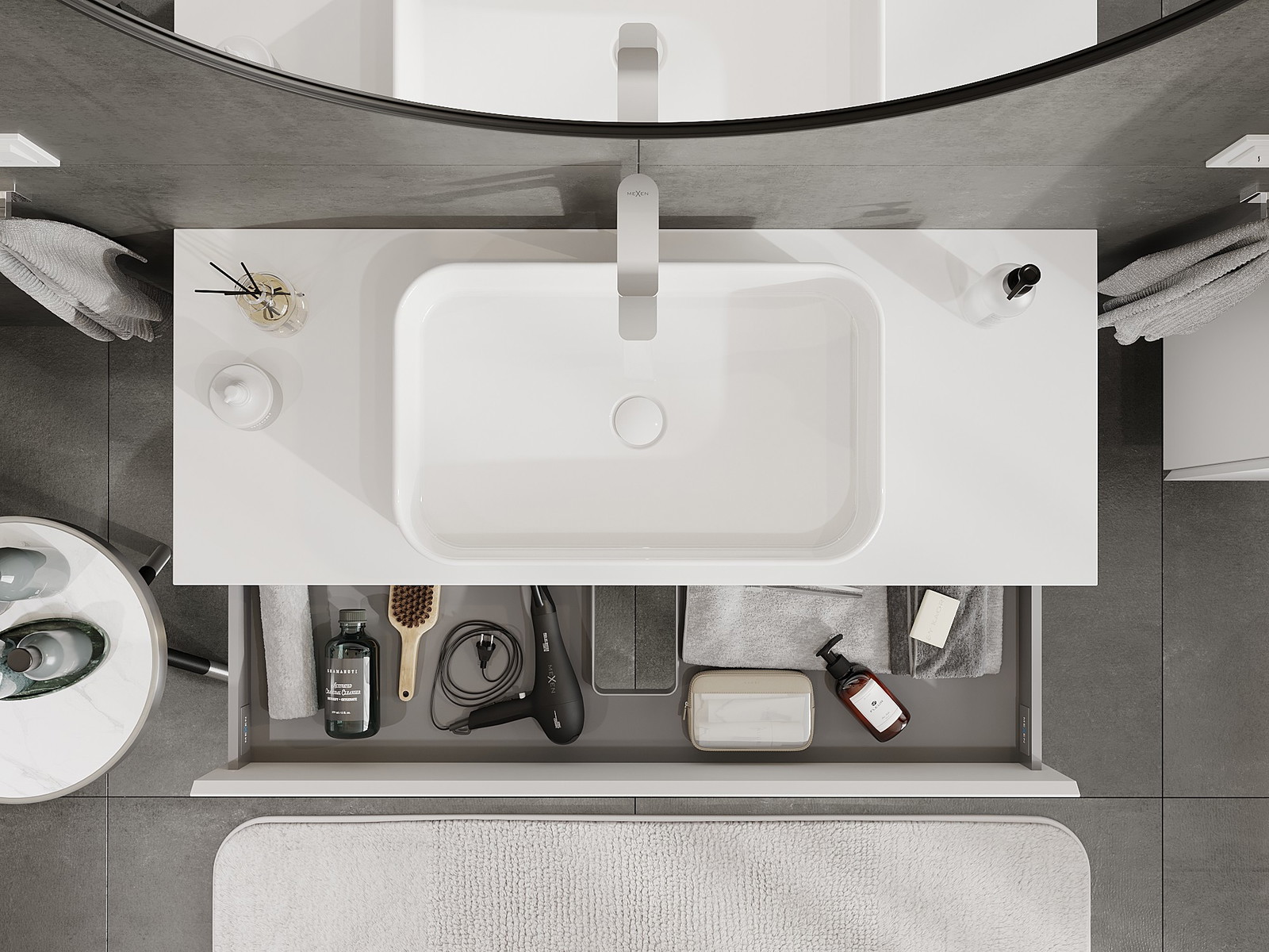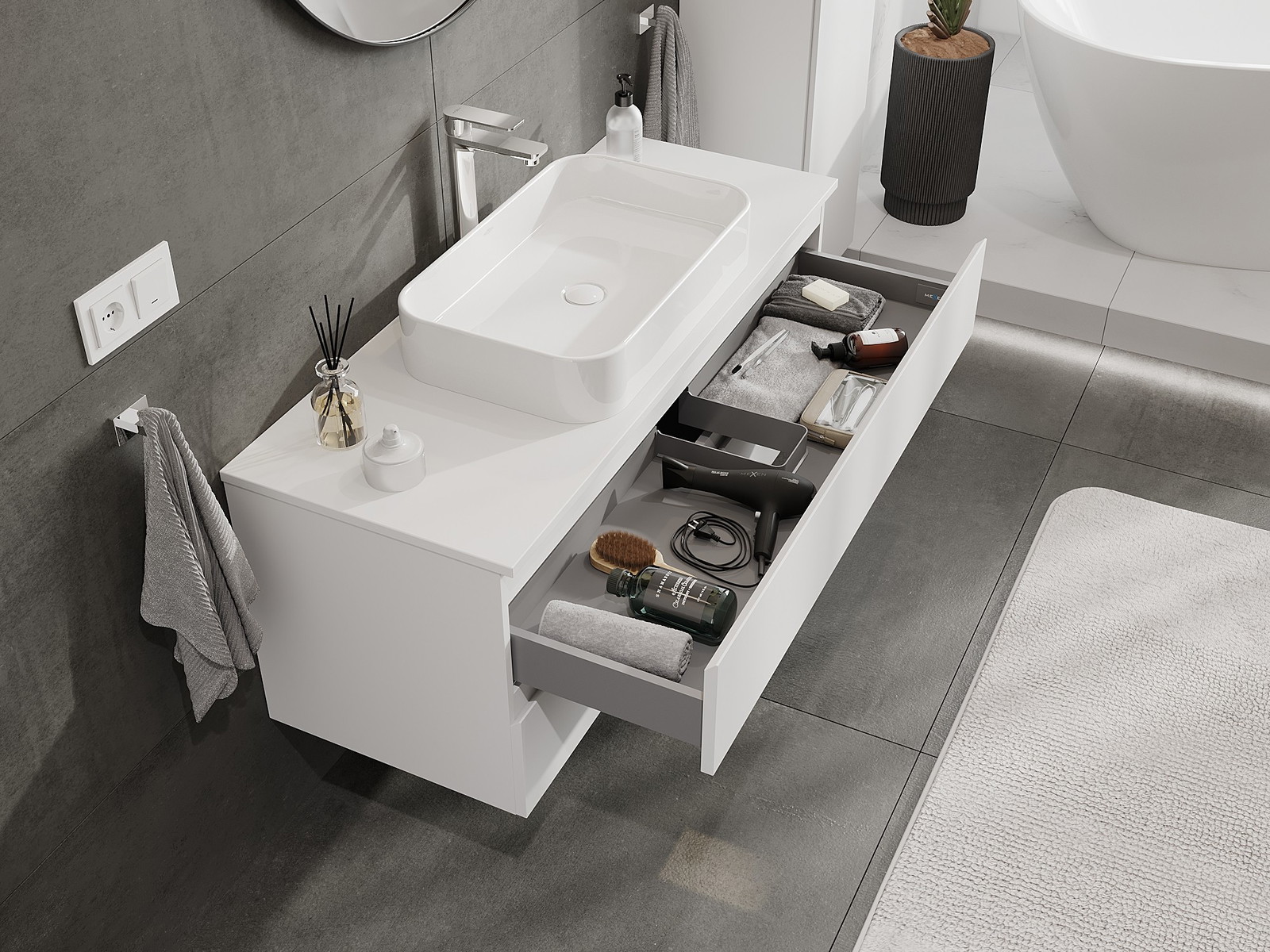 A fiókban lévő kivágás úgy van kialakítva, hogy befogadja a mosdó telepítéseknél szükséges szifont. Ennek köszönhetően a bútor teljesen funkcionálisan felszerelhető anélkül, hogy a fiók terének egy részét fel kellene áldozni a telepítés miatt.