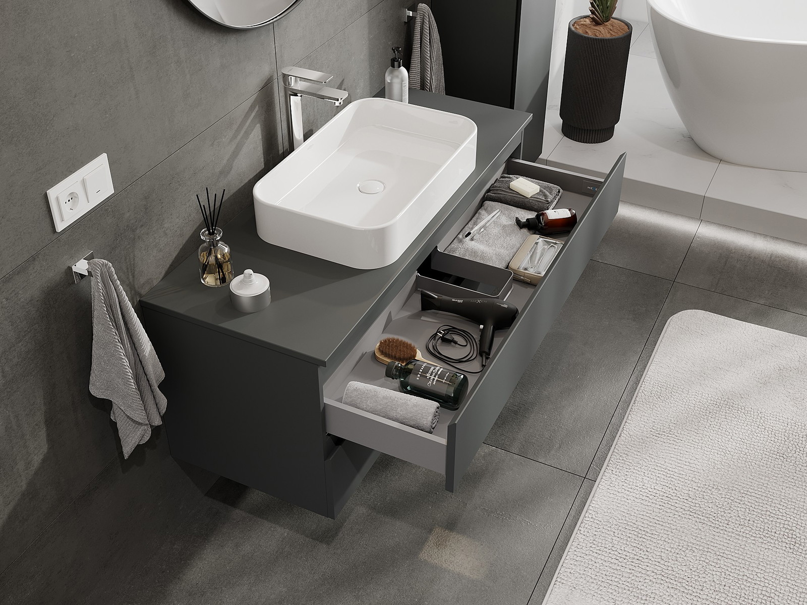 A moduláris fürdőszobabútorainkat különböző színkonfigurációkban lehet kombinálni, lehetővé téve a teljes személyre szabást. Kiválasztható mind az egyes elemek megjelenése, mind pedig funkciói, ami lehetővé teszi a bútorok személyes stílus- és használati preferenciákhoz való igazítását.
