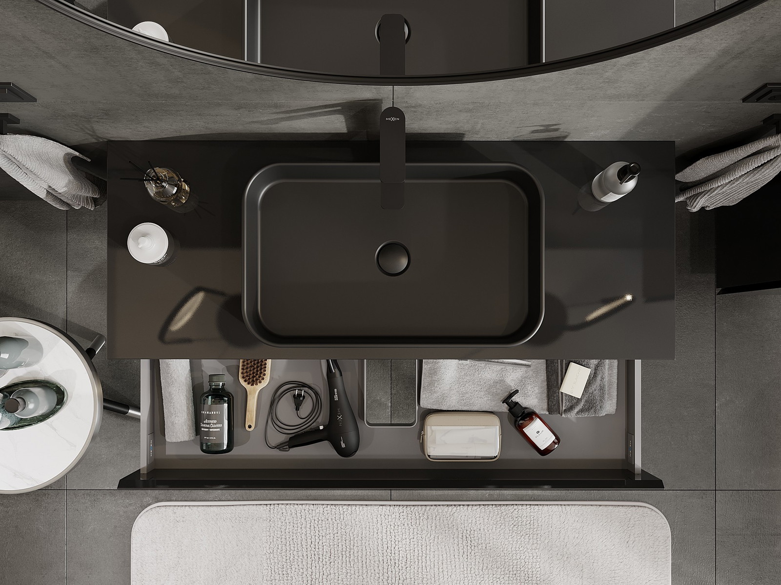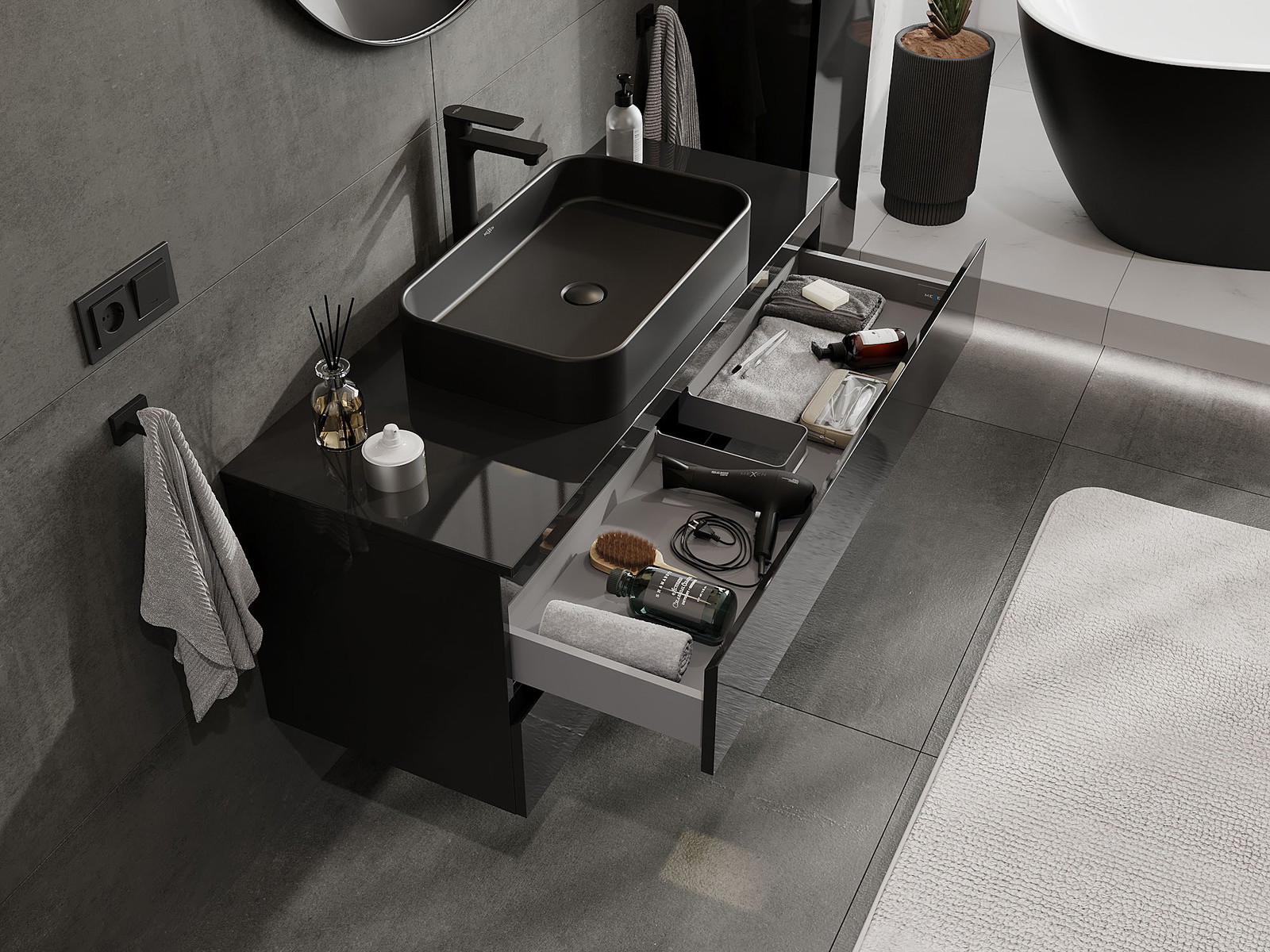 A fiókban lévő kivágás úgy van kialakítva, hogy befogadja a mosdó telepítéseknél szükséges szifont. Ennek köszönhetően a bútor teljesen funkcionálisan felszerelhető anélkül, hogy a fiók terének egy részét fel kellene áldozni a telepítés miatt.