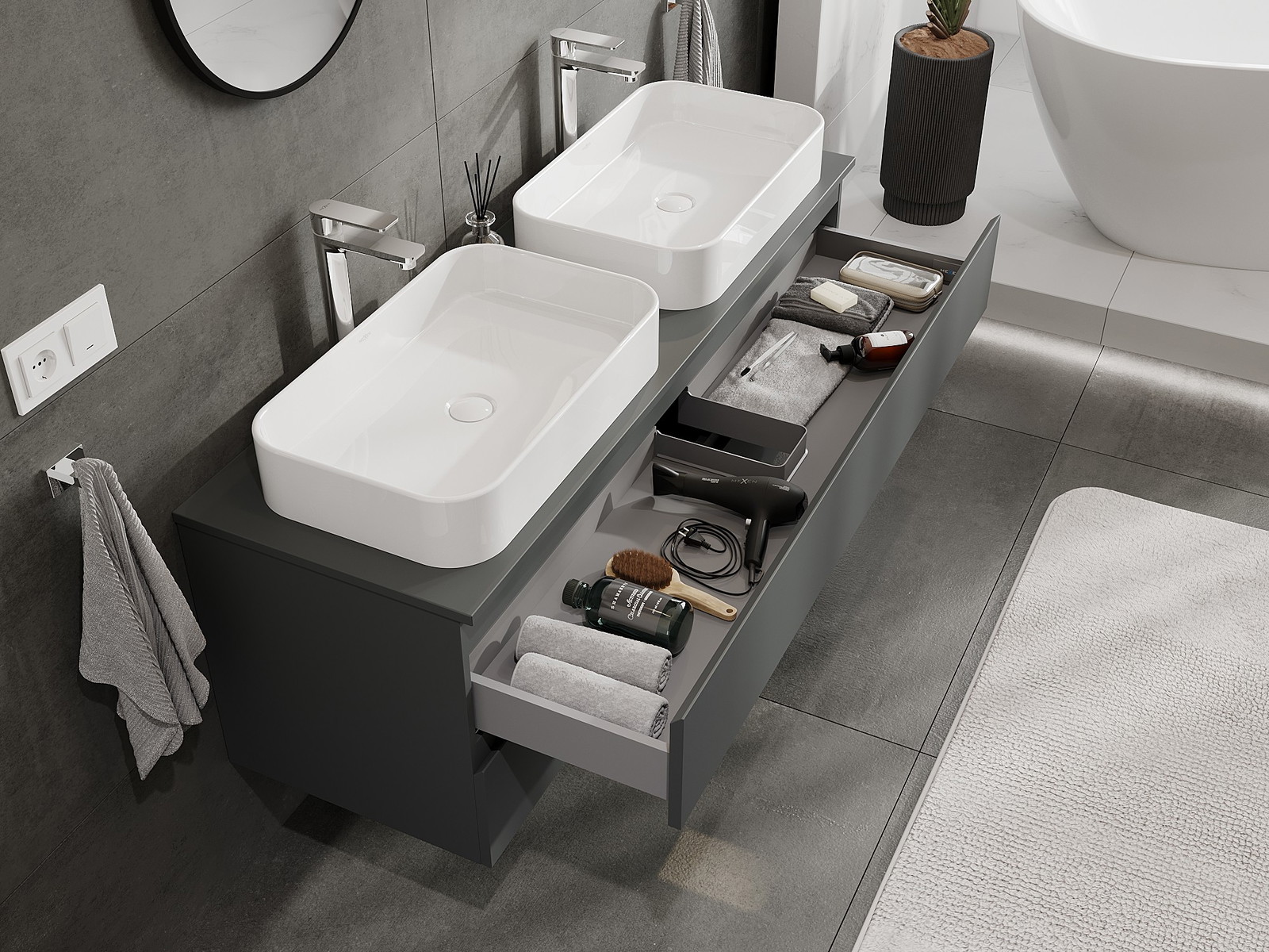 A moduláris fürdőszobabútorainkat különböző színkonfigurációkban lehet kombinálni, lehetővé téve a teljes személyre szabást. Kiválasztható mind az egyes elemek megjelenése, mind pedig funkciói, ami lehetővé teszi a bútorok személyes stílus- és használati preferenciákhoz való igazítását.