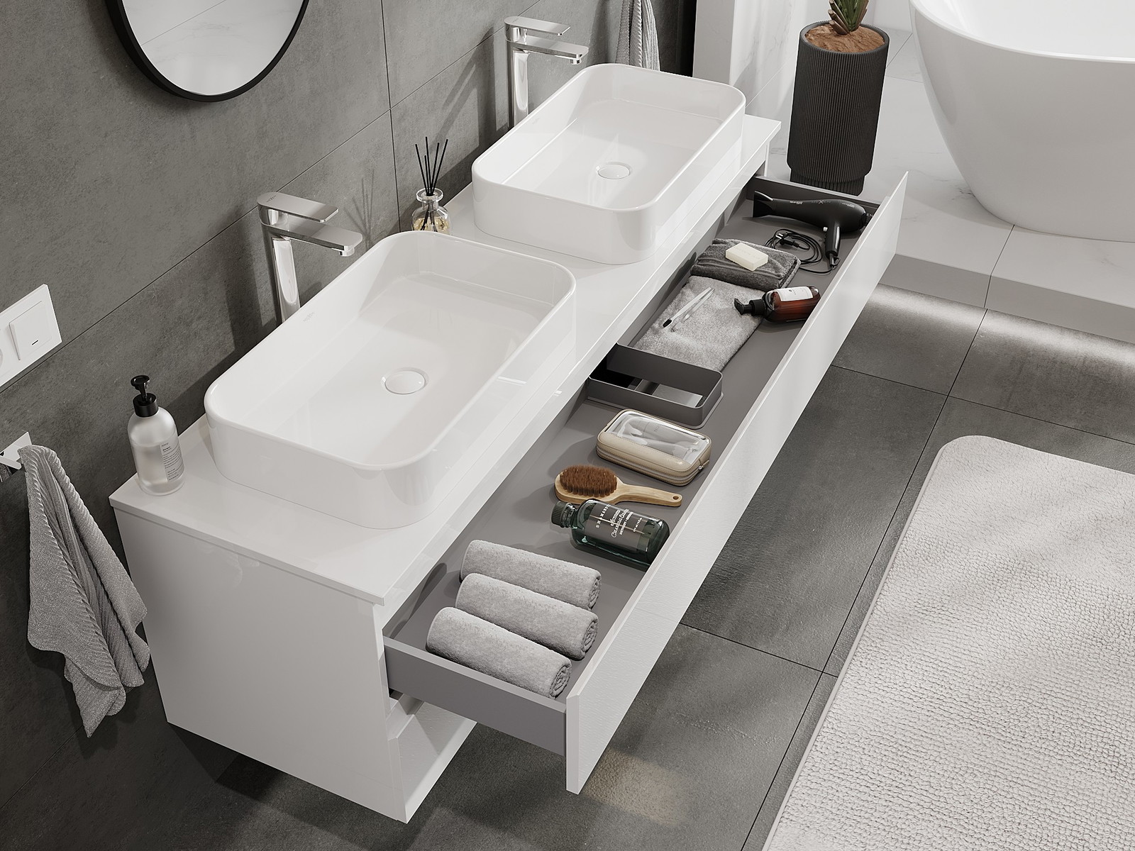 A fiókban lévő kivágás úgy van kialakítva, hogy befogadja a mosdó telepítéseknél szükséges szifont. Ennek köszönhetően a bútor teljesen funkcionálisan felszerelhető anélkül, hogy a fiók terének egy részét fel kellene áldozni a telepítés miatt.