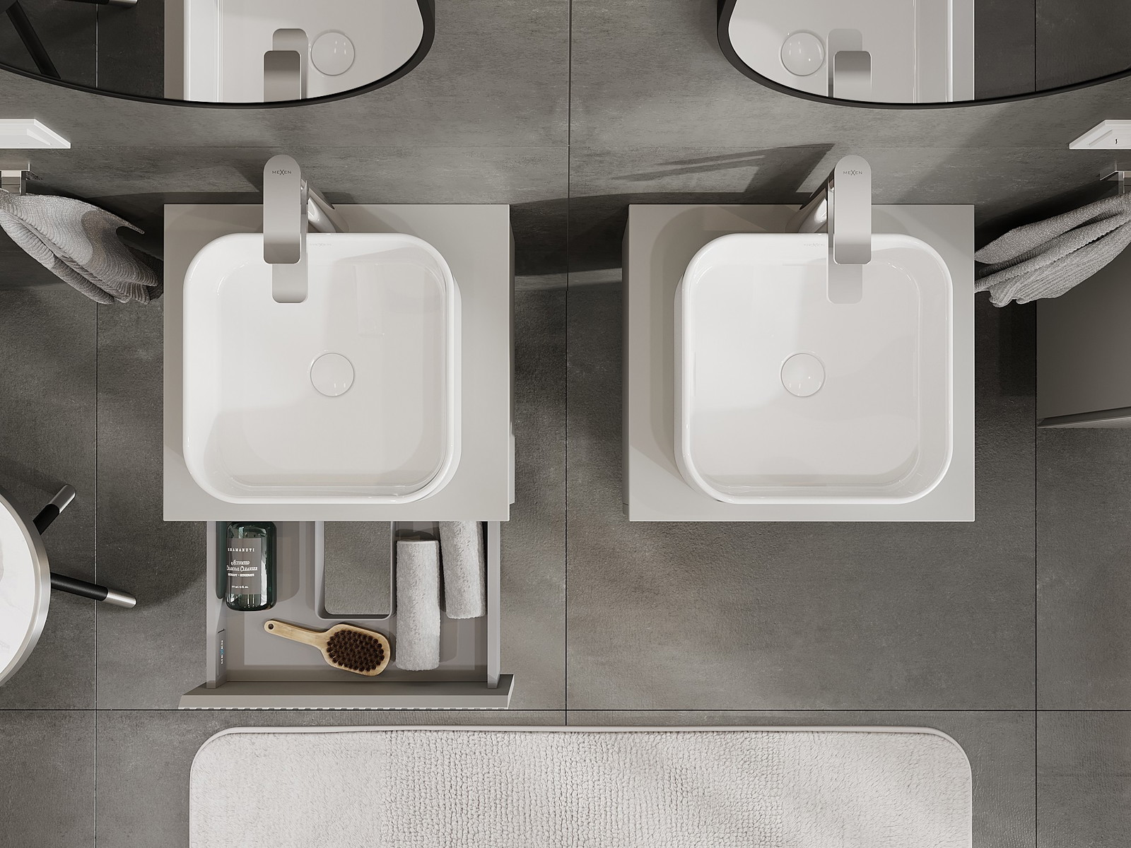 A moduláris fürdőszobabútorainkat különböző színkonfigurációkban lehet kombinálni, lehetővé téve a teljes személyre szabást. Kiválasztható mind az egyes elemek megjelenése, mind pedig funkciói, ami lehetővé teszi a bútorok személyes stílus- és használati preferenciákhoz való igazítását.