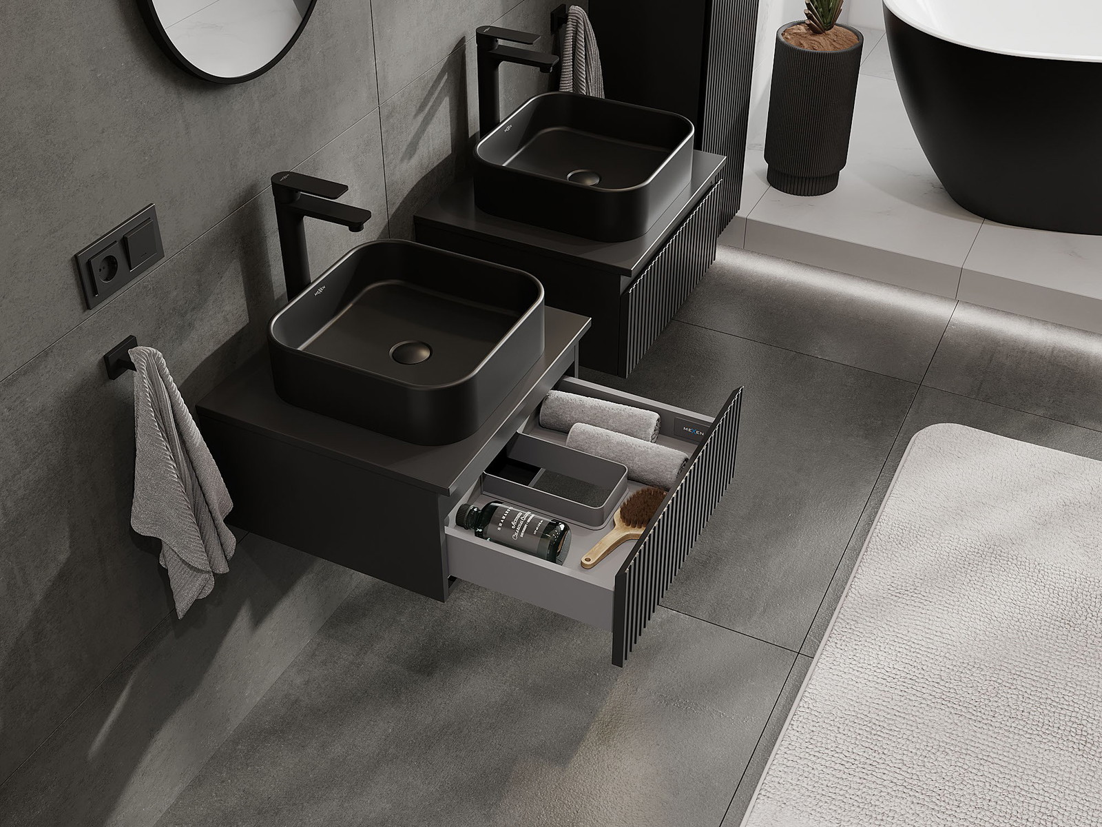 Mexen Rivel fürdőszobai mosdószekrény 50 cm munkalappal, 1 fiók, redőzött, fekete matt - 91A20-05023-1-BFC71