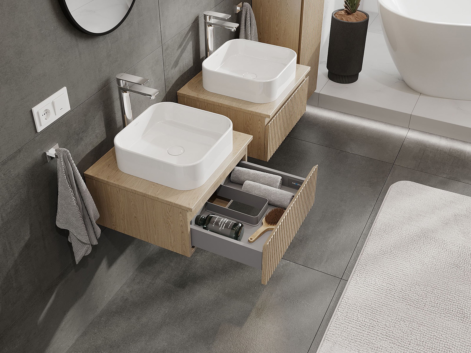 A moduláris fürdőszobabútorainkat különböző színkonfigurációkban lehet kombinálni, lehetővé téve a teljes személyre szabást. Kiválasztható mind az egyes elemek megjelenése, mind pedig funkciói, ami lehetővé teszi a bútorok személyes stílus- és használati preferenciákhoz való igazítását.