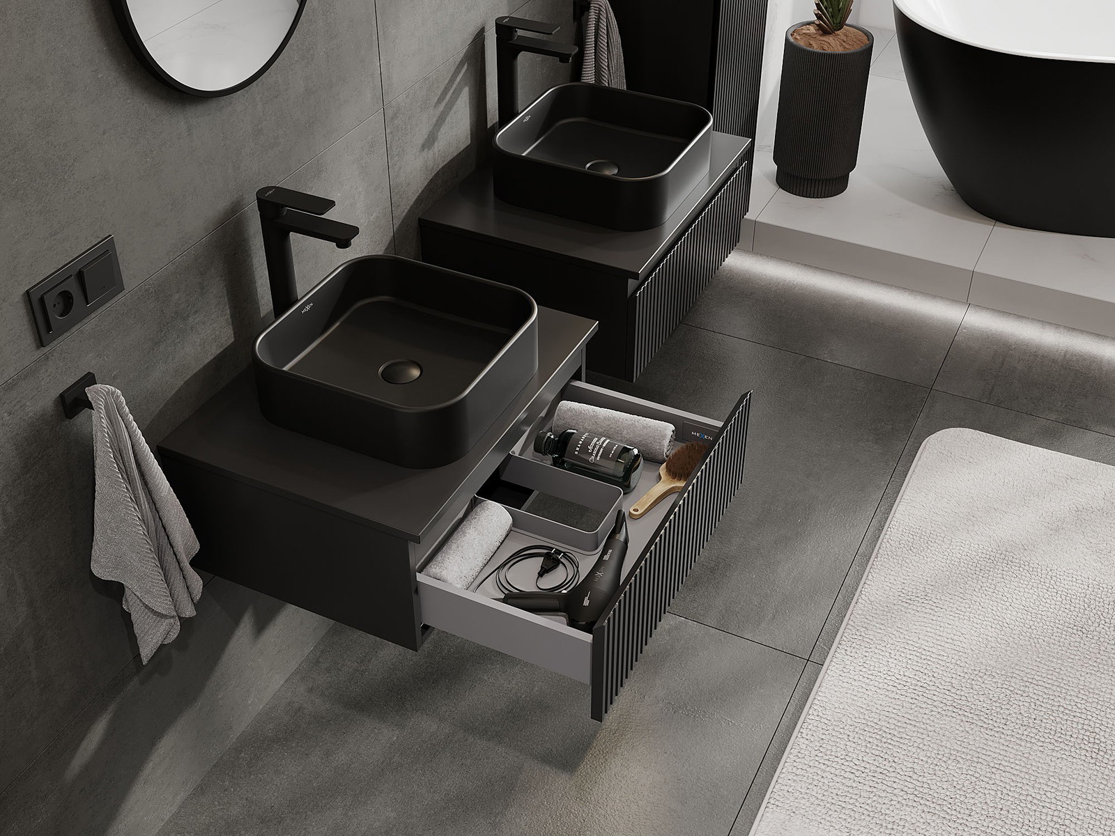 Mexen Rivel 60 cm-es mosdó alatti fürdőszobaszekrény lappal, 1 fiók, bordázott, fekete matt - 91A20-06023-1-BFC71
