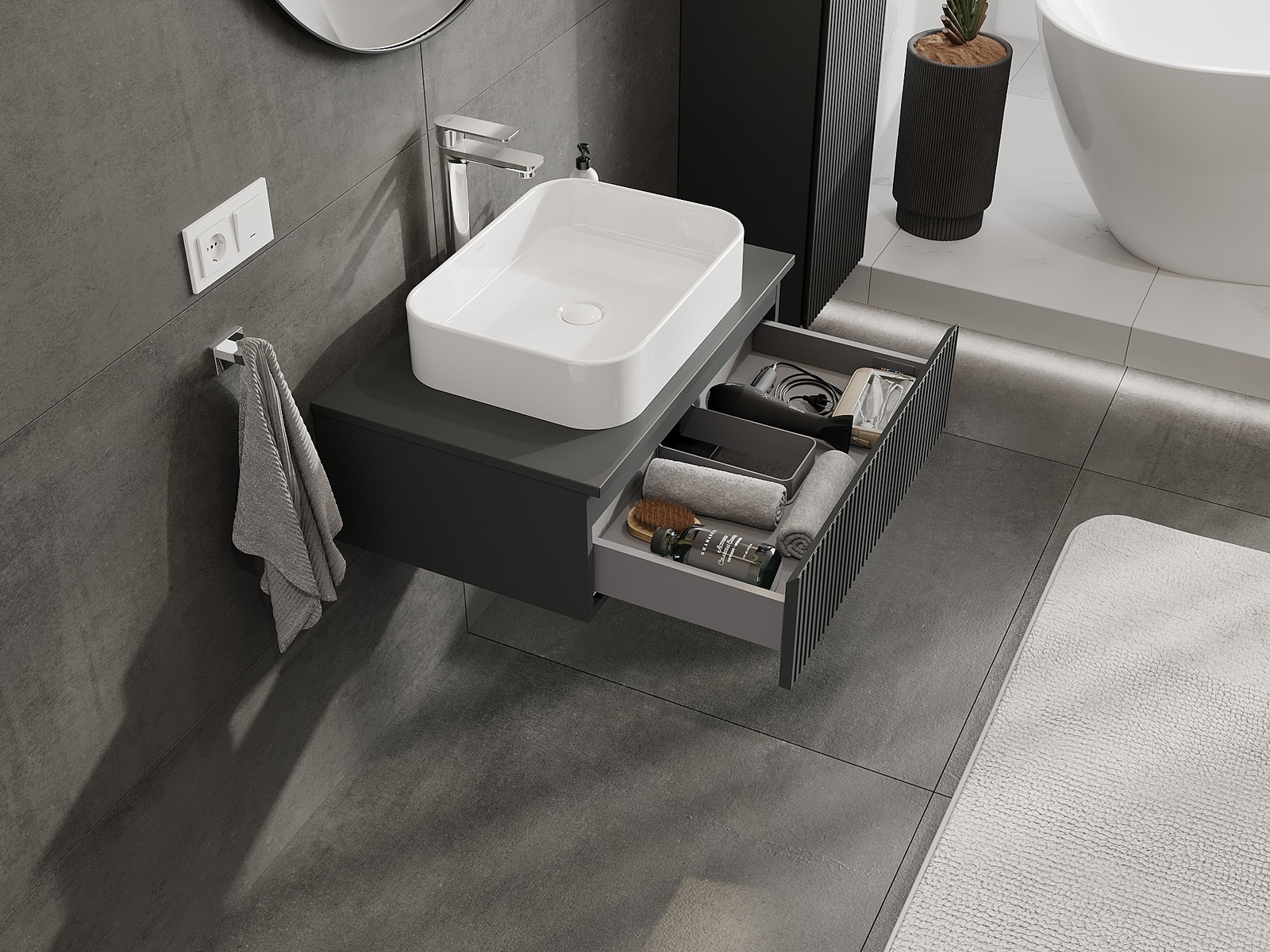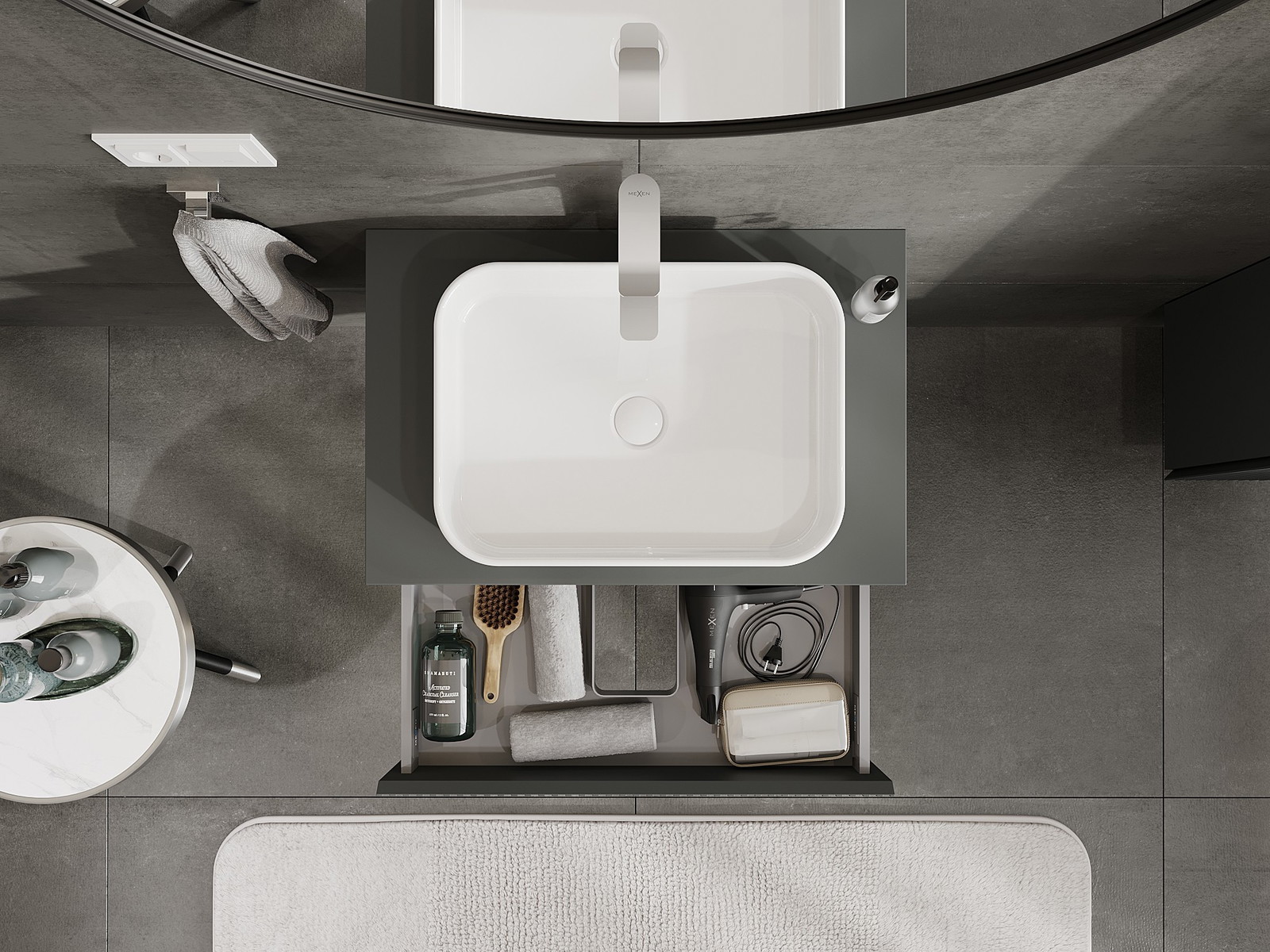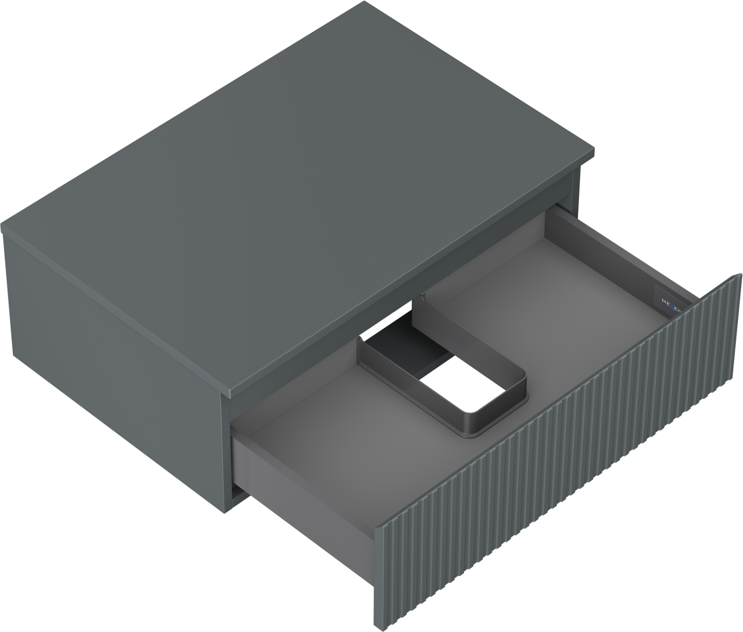 A fiókban lévő kivágás úgy van kialakítva, hogy befogadja a mosdó telepítéseknél szükséges szifont. Ennek köszönhetően a bútor teljesen funkcionálisan felszerelhető anélkül, hogy a fiók terének egy részét fel kellene áldozni a telepítés miatt.