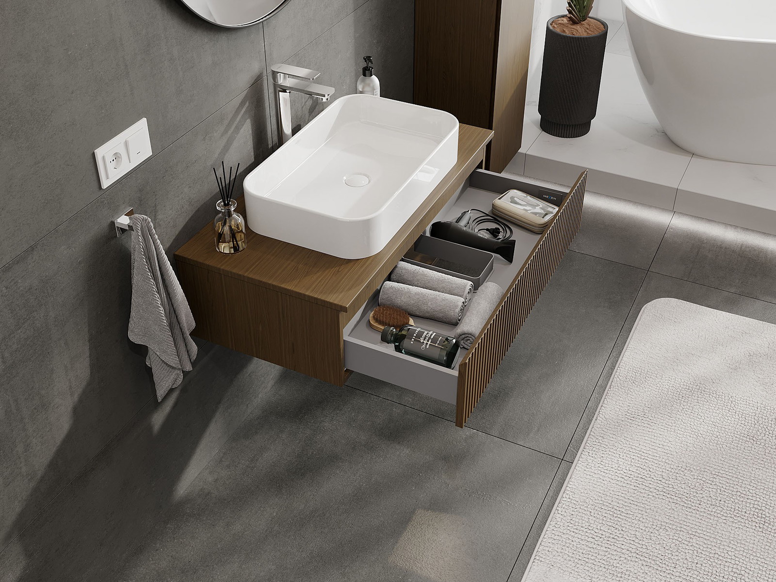 A fiókban lévő kivágás úgy van kialakítva, hogy befogadja a mosdó telepítéseknél szükséges szifont. Ennek köszönhetően a bútor teljesen funkcionálisan felszerelhető anélkül, hogy a fiók terének egy részét fel kellene áldozni a telepítés miatt.