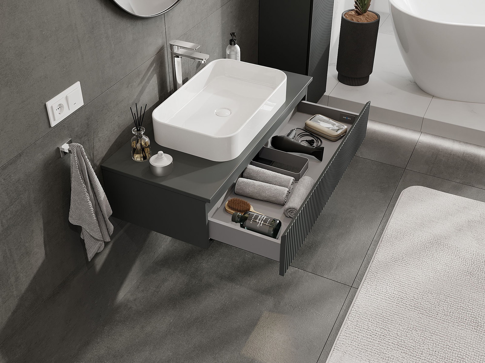 A fiókban lévő kivágás úgy van kialakítva, hogy befogadja a mosdó telepítéseknél szükséges szifont. Ennek köszönhetően a bútor teljesen funkcionálisan felszerelhető anélkül, hogy a fiók terének egy részét fel kellene áldozni a telepítés miatt.