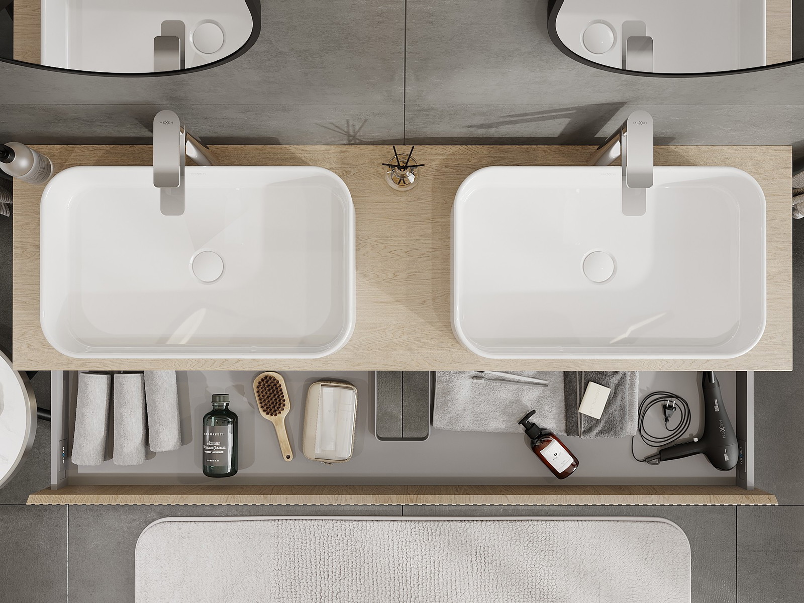 A fiókban lévő kivágás úgy van kialakítva, hogy befogadja a mosdó telepítéseknél szükséges szifont. Ennek köszönhetően a bútor teljesen funkcionálisan felszerelhető anélkül, hogy a fiók terének egy részét fel kellene áldozni a telepítés miatt.