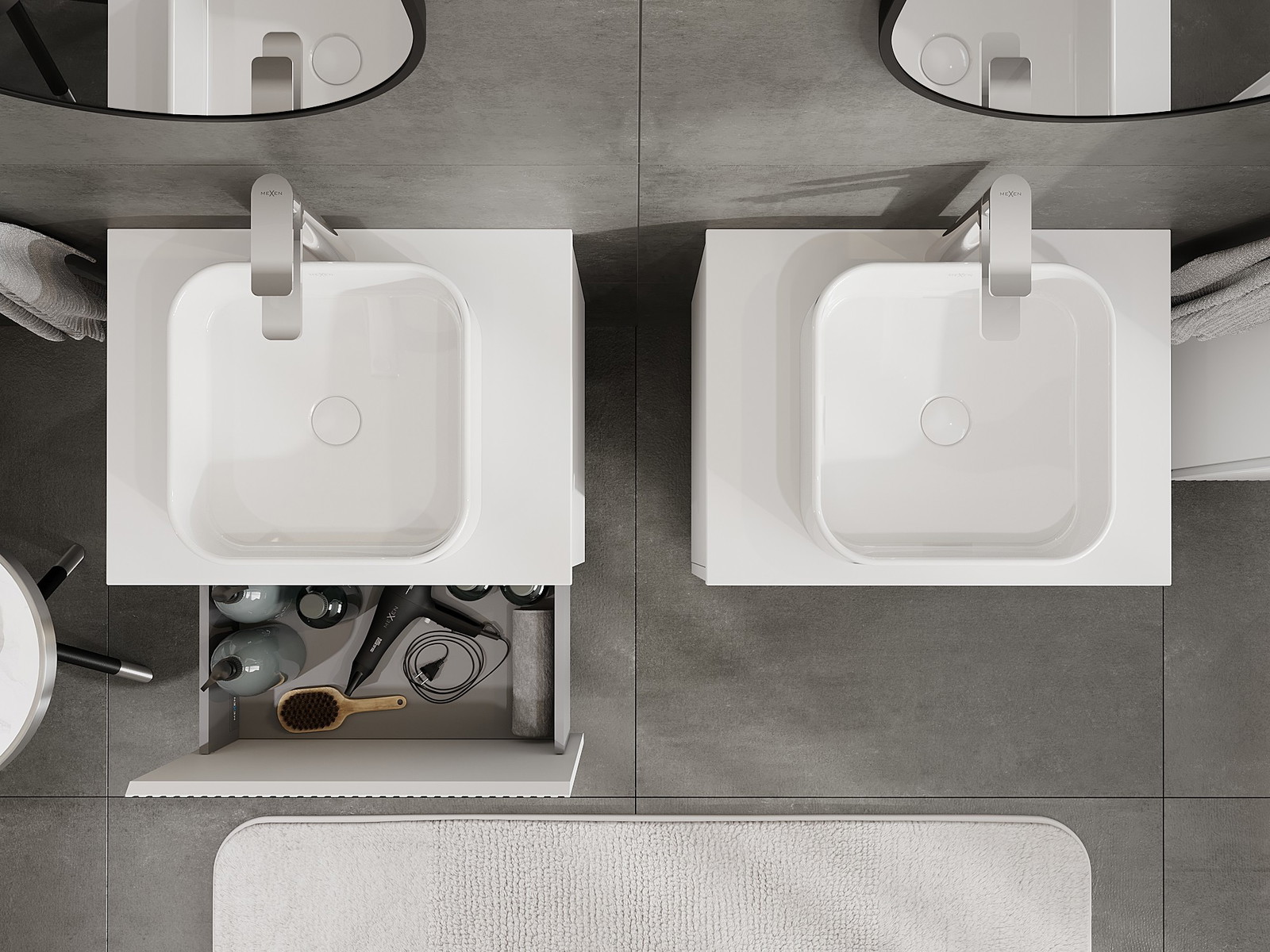 A fiókban lévő kivágás úgy van kialakítva, hogy befogadja a mosdó telepítéseknél szükséges szifont. Ennek köszönhetően a bútor teljesen funkcionálisan felszerelhető anélkül, hogy a fiók terének egy részét fel kellene áldozni a telepítés miatt.
